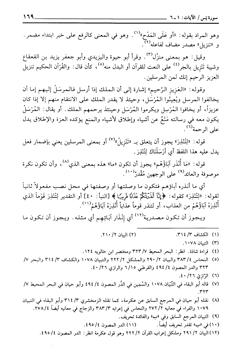 وقيل: هو بمعنى منزِّل وقرأ أبو حيوة واليزيدي وأبو جعفر يزيد بن القعقاع وشيبة تَنْزِيل بالجر على النعت للقرآن أو البدل منه، كأن قال: والقُرْآن الحكيم تنزيل العزيز الرحيم إنك لمن المرسلين.