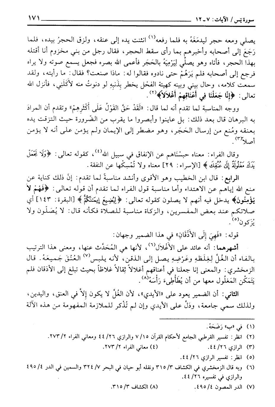 الثاني: أن الضمير يعود على «الأيدي» لأن الغُلَّ لا يكون إلاَّ في العنق، واليدين، ولذلك سمي جامعة، ودَلَّ على الأيدي وإن لم تُذْكر للملازمة المفهومة من هذه الآلة