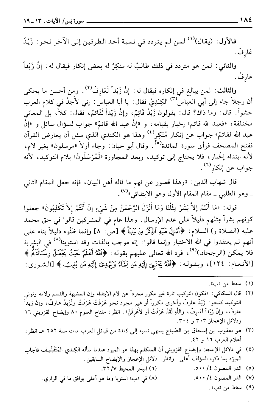 والثالث: لم يبالغ في إنكاره فيقال له: إنَّ زَيْداً لَعاَرِفٌ ومن أحسن ما يحى أن رجلاً جاء إلى أبي العباس الكِنْديِّ فقال: يا أبا العباس: إني لأجدُ في كلام العرب حشواً قال: وما ذالك؟ قال: يقولون زُيْدٌ قَائِمٌ، وإنَّ زَيْداً لَقَائمٌ، فقال: كلاَّ، بل المعاني مختلفة، «فعبد الله قائم» إخبار بقيامة، و «إنَّ عبد الله قائمٌ» جواب لسؤال سائل و «إنَّ عبد الله لقائمٌ» جواب عن إنكار مُنْكِر وهذا هوا لكندي الذي سئل أن يعارض القرآن ففتح المصحف فرأى سورة المائدة وقال أبو حيان: وجاء أولاً «مرسلون» بغير لام، لأنه ابتداء إخْبار، فلا يحتاج إلى توكيد، وبعد المجاورة «لَمُرْسَلُونَ» بلام التوكيد، لأنه جواب عن إنكارٍ.