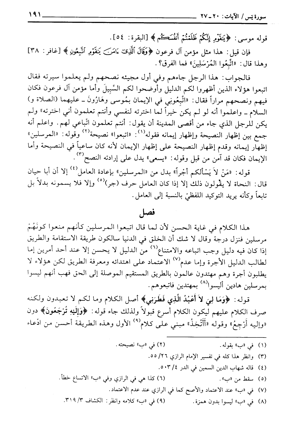 فالجواب: هذا الرجل جاءهم وفي أول مجيئه نصحهم ولم يعلموا سيرته فقال اتبعوا هؤلاء الذين أظهروا لكم الدليل وأوضحوا لكم السَّبِيلَ وأما مؤمن آل فرعون فكان فيهم ونصحهم مراراً فقال: «اتَّبِعُونِي في الإيمان بمُوسى وهَارُونَ - عليهما (الصلاة و) السلام - واعلموا أنه لو لم يكن خيراًلما اخترته لنفسي وأنتم تعلمون أني اخترته» ولم يكن للرجل الذي جاء من أقصى المدينة أن يقول: أنتم تعلمون اتّباعي لهم. واعلم أنه جمع بين إظهار النصيحة وإظهار إيمانه فقوله: «اتبعوا» نصيحة وقوله: «المرسلين» إظهار إيمانه وقدم إظهار النصيحة على إظهار الإيمان لأنه كان ساعياً في النصيحة وأما الإيمان فكان قد آمن من قبل وقوله: «يسعى» على إرادته النصح.