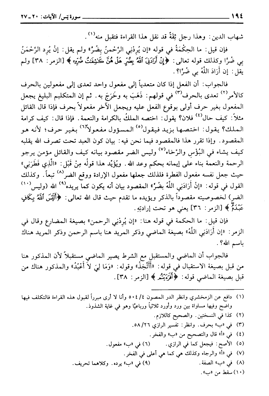 فالجواب: أن الفعل إذا كان متعدياً إلى مفعول واحد تعدى إلى مفعولين بالحرف كالأمر تعدى بالحرف في قولهم: ذَهَبَ به وخَرَجَ به. ثم إن المتكلم البليغ يجعل المفعول بغير حرف أولى بوقوع الفعل عليه ويجعل الآخر مفعولاً بحرف فإذا قال القائل مثلاً: كيف حال فلان؟ يقول: اختصه الملكُ بالكرامة والنعمة. فإذا قال: كيف كرامة الملك؟ يقول: اختصها بزيد فيقول المسؤول مفعولاً بغير حرف؛ لأنه هو المقصود وإذا تقرر هذا فالمقصود فيما نحن فيه: بيان كون العبد تحت تصرف الله يقلبه كيف يشاء في البُؤْسِ والرَّخاء وليس الضر مقصود بيانه كيف والقائل مؤمن يرجو الرحمة والنعمة بناء على إيمانه بحكم وعد الله ويُؤَيِّد هذا قولُه مِنْ قَبْل: «الَّذِي فَطَرَنِي» حيث جعل نفسه مفعول الفطرة فلذلك جعلها مفعول الإرادة ووقع الضر تبعاً وكذلك القول في قوله: «إنْ أَرَادَنِي اللَّهُ بضُرِّ» المقصود بيان أنه يكون كما يريده الله (وليس الضر) لخصوصيته مقصوداً بالذكر ويؤيده ما تقدم حيث قال الله تعالى: