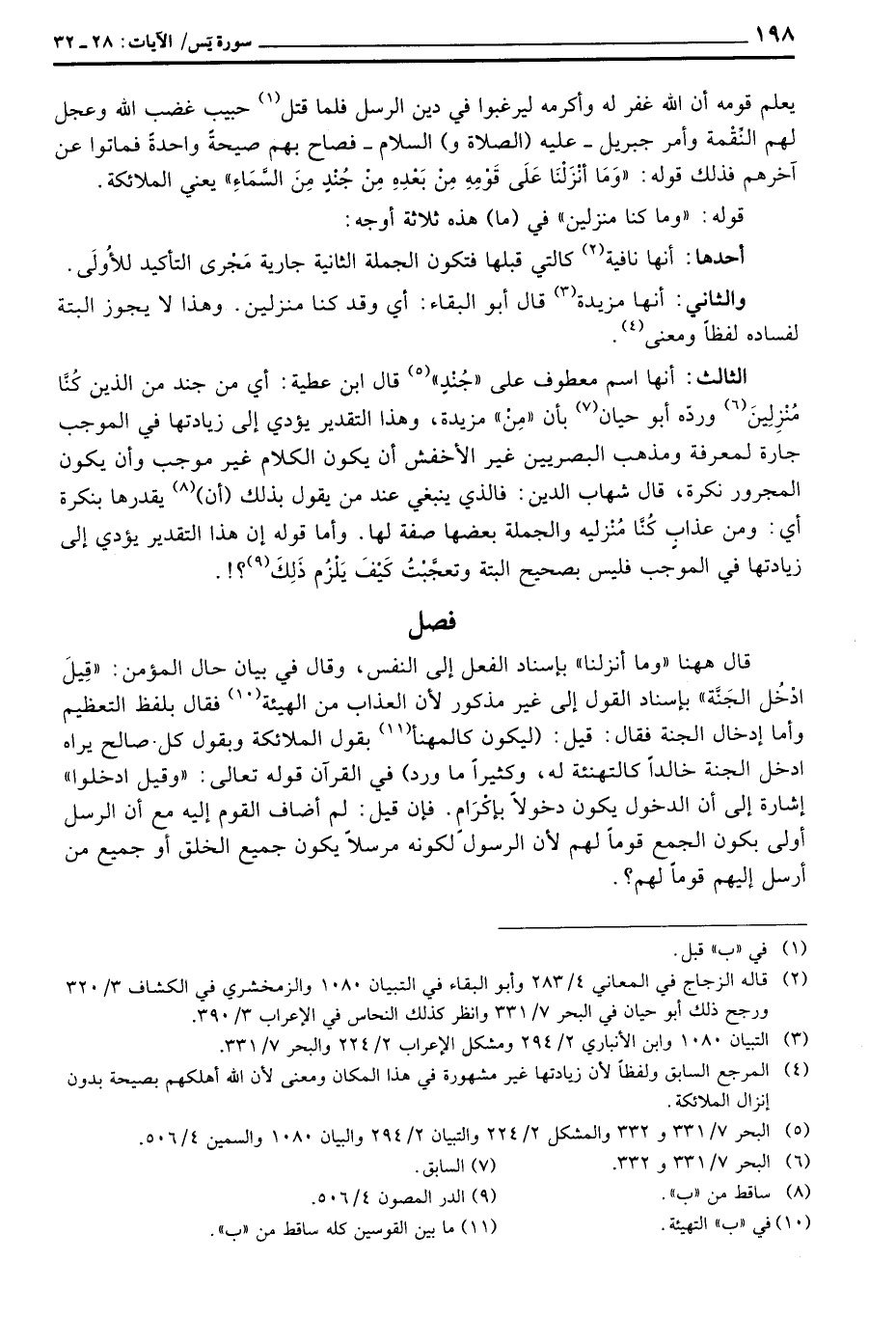 الثالث: أنها اسم معطوف على «جُنْدٍ» قال ابن عطية: أي من جند من الذين كُنَّا مُنْزِلينَ وردّه أبو حيان بأن «مِنْ» مزيدة، وهذا التقدير يؤدي إلى زيادتها في الموجب جار لمعرفة ومذهب البصريين غير الأخفش أن يكون الكلام غير موجب وأن يكون المجرور نكرة، قال شهاب الدين: فالذي ينبغي عند من يقول بذلك (أن) يقدرها بنكرة أي: ومن عذاب كُنَّا مُنْزليه والجملة بعضها صفة لها وأما قوله إن هذا التقدير يؤدي إلى زيادتها في الموجب فليس بصحيح البتة وتعجَّبْتُ كَيْفَ يَلْزُم ذَلِكَ؟! .