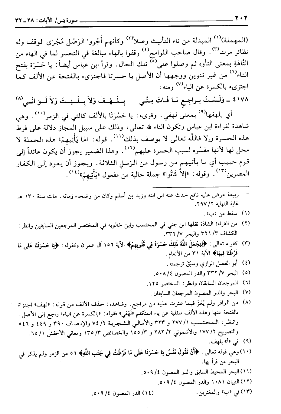 أي بلهفها بمعنى لهفي وقرئ: يا حَسْرتَا بالألف كالتي في الزمر وهي شاهدة لقراءة ابن عباس وتكون التاء لله تعالى، وذلك على سبل المجاز دلالة على فرط هذه الحسرة وإلا فاللَّه تعالى لا يوصف بذلك قوله: «مَا يَأْتِيهِمْ» هذه الجملة لا محل لها لأنها مفسِّرة لسبب الحسرة عليهم وهذا الضمير يجوزأن يكون عائداً إلى قوم حبيب أي ما يأتيهم من رسول من الرّسلِ الثلاثة. ويجوز: أن يعود إلى الكفار المصرين وقوله: «إلاَّ كَانُوا» جملة حالية من مفعول «يَأْتِيهِمْ» .