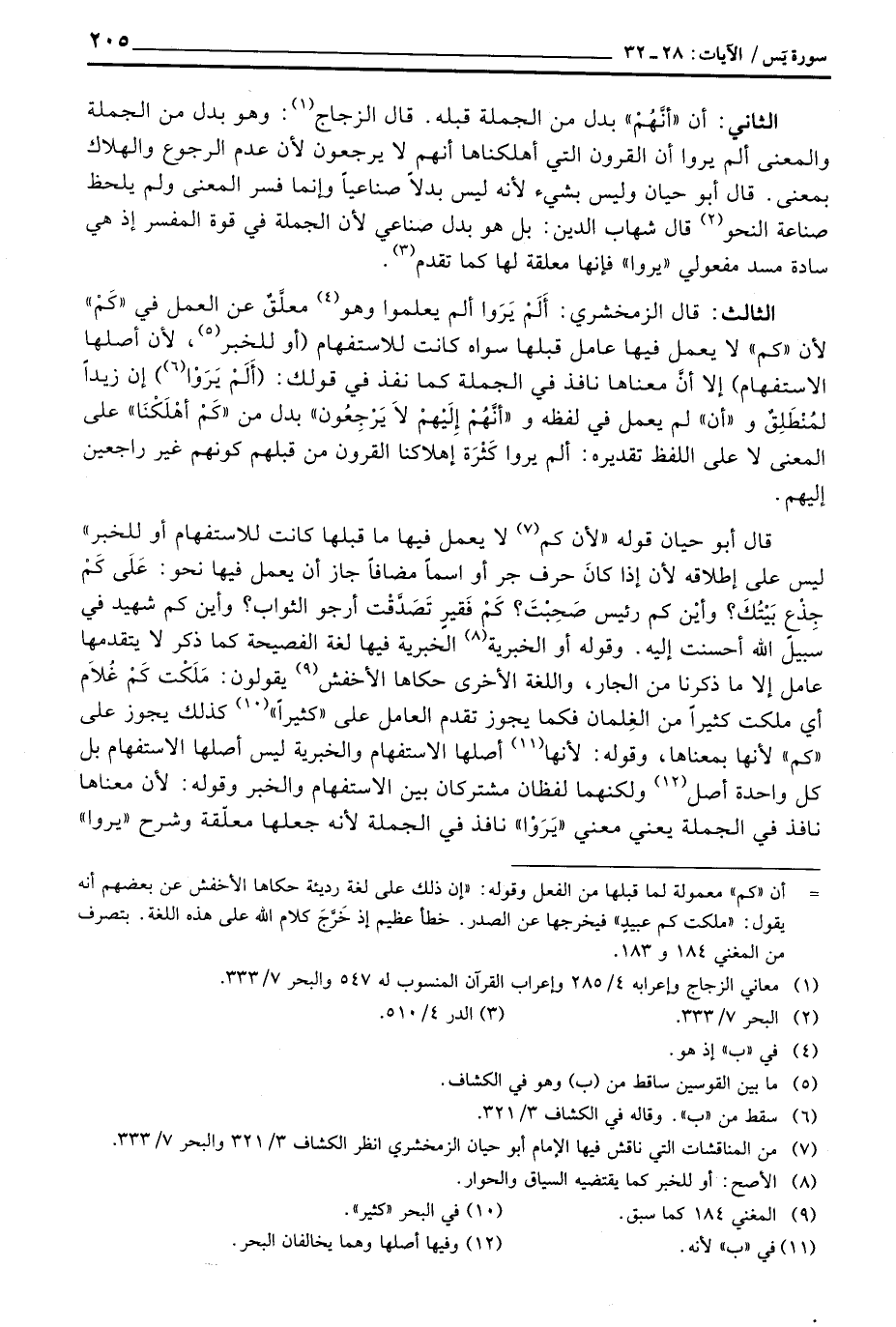 قال أبو حيان قوله «لأن كم لا يعمل فيها ما قبلها كانت للاستفهام أو للخبر» ليس على إطلاقه لأن إذا كانَ حرف جر أو اسماً مضافاً جاز أن يعمل فيها نحو: عَلَى كَمْ جِذْع بَيْتُكَ؟ وأيْن كم رئيس صَحِبْتَ؟ كَمْ فَقير تَصَدَّقْت أرجو الثواب؟ وأين كم شهيد في سبل الله أحسنت إليه. وقوله أو الخبرية الخبرة فيها لغة الفصيحة كما ذكر لا يتقدمها عامل إلا ما ذكرنا من الجار، واللغة الأخرى حكاها الأخفض يقولون: مَلَكْت كَمْ غُلاَم اي ملكت كثيراً من الغِلمان فكما يجوز تقدم العامل على كثيراً كذلك يجوز على «كم» لأنها بمعناها. وقوله: لأنها أصلها الاستفهام والخبرية ليس اصلها الاستفهام بل كل واحدة أصل ولكنهما لفظان مشتركان بين الاستفهام والخبر وقوله: لأن معناها نافذ في الجملة يعني معنى «يَرَوْا» نافذ في الجملة لأنه جعلها معلقة وشرح «يروا»