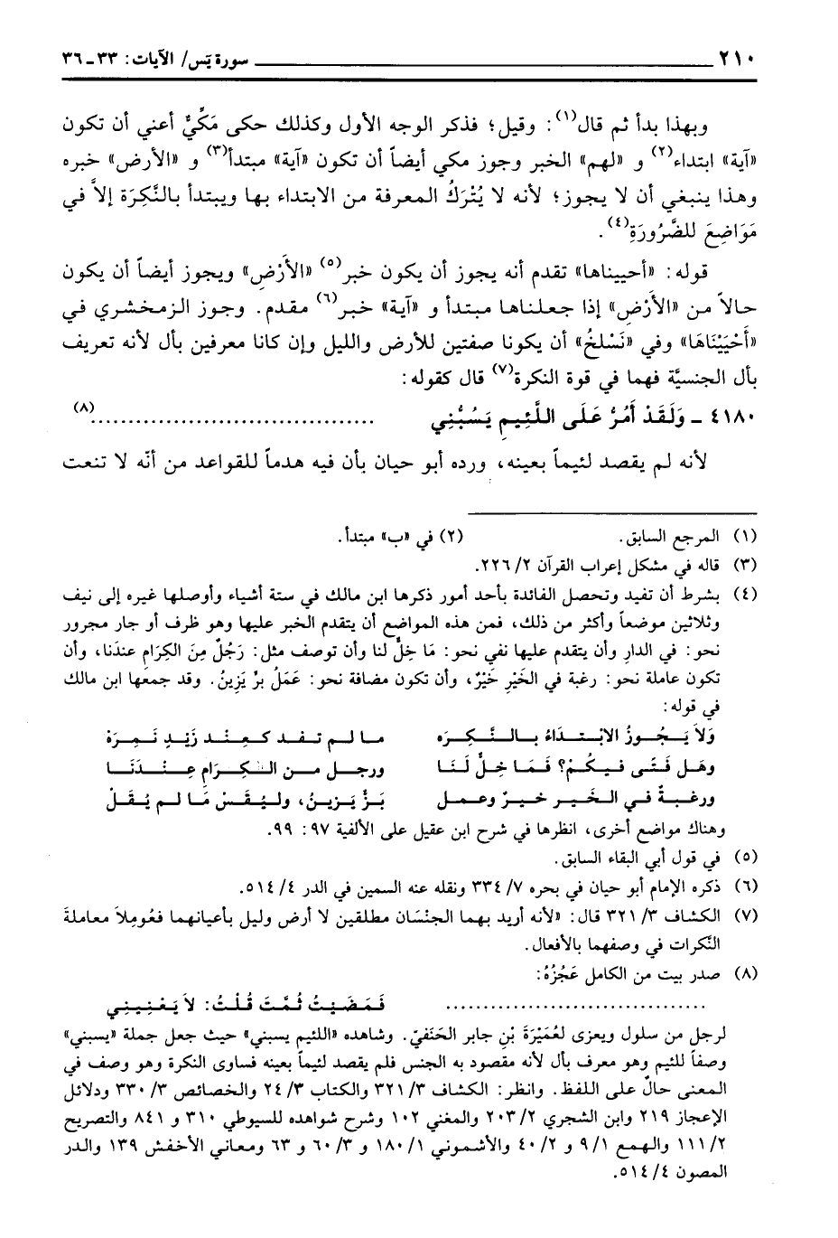 وبهذا بدأ ثم قال: وقيل؛ فذكر الوجه الأول وكذلك حكى مَكِّيٌّ أعني أن تكون «آية» ابتداء و «لهم» الخبر وجوز مكي أيضاً أن تكون «آية» متبدأ و «الأرض» خبره وهذا ينبغي أن لا يجوز؛ لأنه لا يُتْرَكُ المعرفة من الابتداء بها ويبتدأ بالنَّكِرَة إلاَّ في مَوَاضِعَ للضَّرُورَةِ.