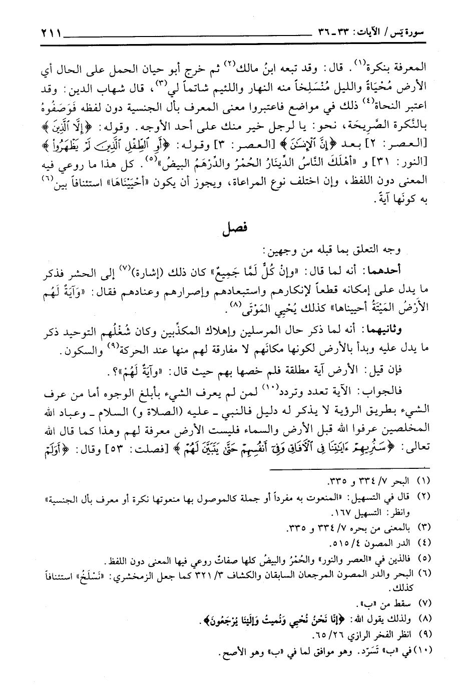المعرفة بنكرة قال: وقد تبعه ابنُ مالك ثم خرج أبو حيان الحمل على الحال أي الأرض مُحْيَاةً والليل مُنْسَلِخاً منه النهار واللئيم شاتماً لي، قال شهاب الدين: وقد اعتبر النحاة ذلك في مواضع فاعتبروا معنى المعرف بأل الجنسية دون لفظه فَوَصَفُوهُ بالنَّكرة الصَّرِيحَة، نحو: يا لرجل خير منك على أحد الأوجه. وقوله: {إِلاَّ الذين} [العصر: 3] بعد {إِنَّ الإنسان} [العصر: 2] وقوله: {أَوِ الطفل الذين لَمْ يَظْهَرُواْ} [النور: 31] و «أهْلَكَ النَّاسُ الدِّينَارُ الحُمْرُ والدِّرْهَمُ البيضُ» كل هذا ما روعي فيه المعنى دون اللفظ، وإن اختلف نوع المراعاة، ويجوز أن يكون «أحْيَيْنَاهَا» استئنافاً بين به كونَها آيةً.