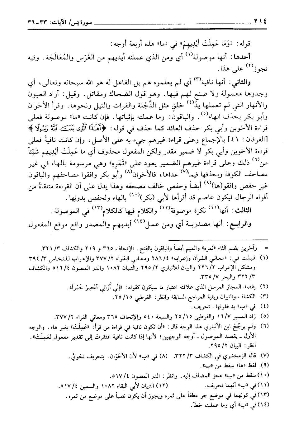 والثاني: أنها نافية أي لم يعلموه هم بل الفاعل له هو الله سبحانه وتعالى، أي وجدها معمولة ولا صنع لهم فيها. وهو قول الضحاك ومقاتل. وقيل: أراد العيون والأنهار التي لم تعلمها يدُ خلقٍ مثل الدِّجْلة والفرات والنيل ونحوها. وقرأ الأخوان وأبو بكر بحذف الهاء والباقون: وما عملته بإثباتها. فإن كانت «ما» موصولة فعلى قراءة الأخوين وأبي بكر حذف العائد كما حذف في قوله: {أهذا الذي بَعَثَ الله رَسُولاً} [الفرقان: 41] بالإجماع وعلى قراءة غيرهم جيء به على الأصل، وإن كانت نافيةً فعلى قراءة الأخوين وأبي بكر لا ضمير مقدر ولكن المفعول محذوف أي ما عَمِلَتْ أيْدِيهم شَيْئاً من ذلك وعلى قراءة غيرهم الضمر يعود على «ثَمَرِهِ» وهي مرسومة بالهاء في غير مصاحف الكوفة وبحذفها فيما عداها، فالأخوان وأبو بكر وافقوا مصاحفهم والباقون غير حفص وافقوا (ها) أيضاً وحفص خالف مصحفه وهذا يدل على أن القراءة متلقاةٌ من أفواه الرجال فيكون عاصم قد أقرأها لأبي (بكر) بالهاء كالكلام في الموصولة.