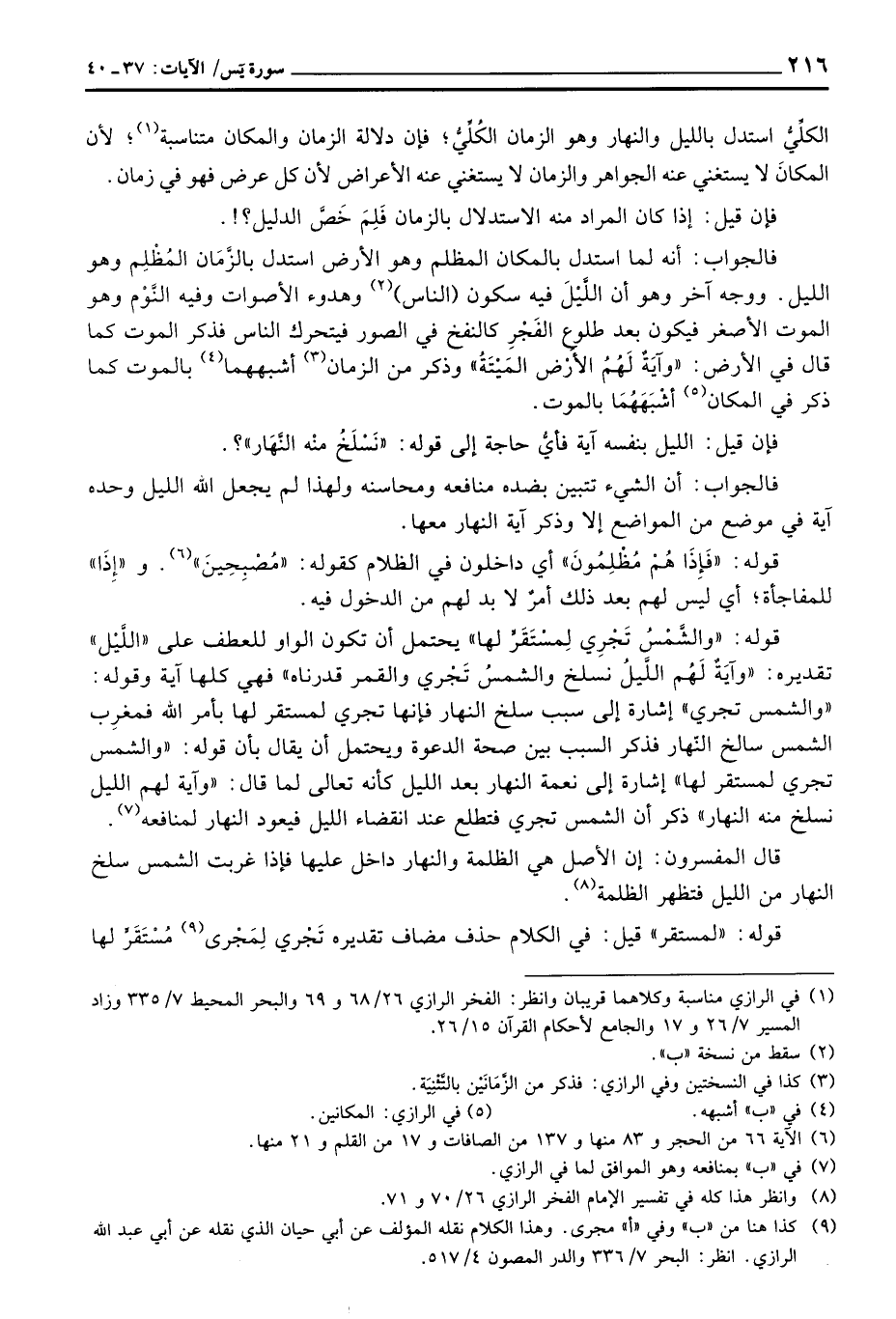 قوله: {والشمس تَجْرِي لِمُسْتَقَرٍّ لَّهَا} يحتمل أن تكون الواو للعطف على «اللَّيْل» تقديره: «وآيَةٌ لَهُم اللَّيلُ نسلخ والشمسُ تَجْري والقمر قدرناه» فيه كلها آية ووقوله «والشمس تجري» إشارة إلى سبب سلخ النهار فإنها تجري لمستقر لها بأم الله فمغرِب الشمس سالخ النّهار فذكر السبب بين صحة الدعوة ويحتمل أن يقال بأن قوله: «والشمس تجري لمستقر لها» إشارة إلى نعمة النهار بعد الليل كأنه تعالى لما قال: «وآية لهم الليل نسلخ منه النهار» ذك أن الشمس تجري فتطلع عن انقضاء الليل فيعود النهار لمنافعه.