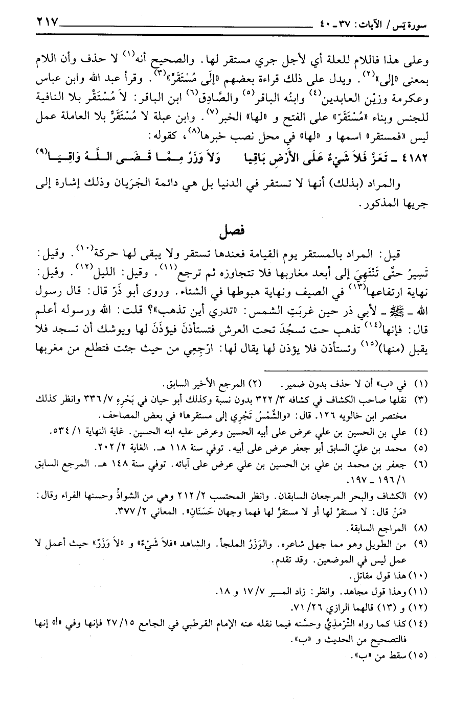 قيل: المراد بالمستقر يوم القيامة فعندها تستقر ولا يقى لها حركة وقيل: تَسِيرُ حتَّى تَنْتَهِيَ إلى أبعد مغاربها فلا تتجاوزه ثم ترجع وقيل: الليل وقيل: نهاية ارتفاعها في الصيف ونهاية هبوطها في الشتاء «وروى أبو ذَرّ قال: قال رسول الله - صَلَّى اللَّهُ عَلَيْهِ وَسَلَّم َ - لأبي ذر حين غربَتِ الشمس:» تدري أين تذهب «؟ قلت: الله ورسوله أعلم قال: فإنها تذهب حت تسجُدَ تحت العرش فتستأذنَ فيؤذَنَ لها ويوشك أن تسجد فلا يقبل (منها) وتستأذن فلا يؤذن لها يقال لها: ارْجِعِي من حيث جئت فتطلع من مغربها