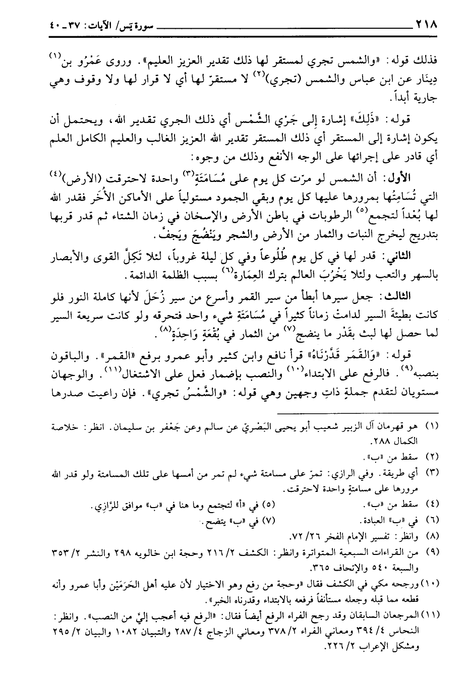 قوله: {والقمر قَدَّرْنَاهُ} قرأ نافع وابن كثير وأبو عمور برفع» القمر «والباقون بنصبه فالرفع على الابتداء والنصب بإضمار فعل على الاشتغال والوجهان مستويان لتقدم جملةٍ ذاتِ وجهين وهي قوله: {والشَّمْسُ تجري} فإن راعيت صدرها