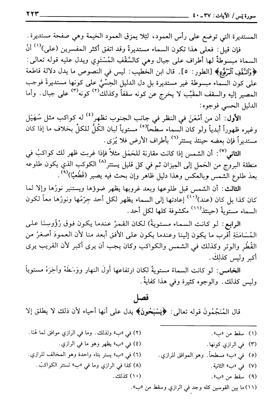 قال المُنَجِّمُونَ قوله تعالى: {يَسْبَحُونَ} يدل على أنها أحياء لأن ذلك لا يطلق إلا
