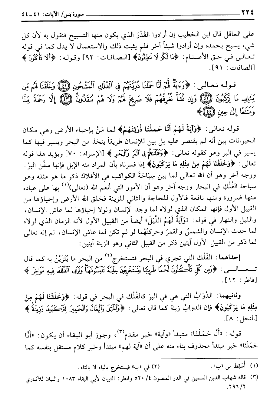 قوله تعالى: {وَآيَةٌ لَّهُمْ أَنَّا حَمَلْنَا ذُرِّيَّتَهُمْ} لما مَنَّ بإحياء الأرض وهي مكان الحيوانات بين أنه لم يقتصر عليه بل بين للإنسان طريقاً يتخذ من البحر ويسير فيها كما يسير في البر وهو كقوله تعالى: {وَحَمَلْنَاهُمْ فِي البر والبحر} [الإسراء: 70] ويؤيد هذا قوله تعالى: {وَخَلَقْنَا لَهُمْ مِّن مِّثْلِهِ مَا يَرْكَبُونَ} إذا فسرناه بأن المراد منه الإبل فإنها سفُن البرِّ. ووجه آخر وهو أن الله تعالى لما بين سِبَاحَةَ الكواكب في الأفلاك ذكر ما هو مثله وهو سباحة الفُلْكِ في البحار ووجه آخر وهو أن الأمور التي أنعم الله (تعالى) بها على عباده منها ضرورة ومنها نافعة فالأول للحاجة والثاني للزينة فخلق الله الأرض وإحياؤها من القبيل الأول فإنها المكان الذي لولاه لما وجد الإنسان ولولا إحياؤها لما عاش الإنسان، والليل والنهار في قوله: {وَآيَةٌ لَّهُمُ الليل} [يس: 37] أيضاً من القبيل الأول لأنه الزمان الذي لولاه لما حدث الإنسان والشمسُ والقمرُ وحركتُهُما لو لم تكن لما عاش الإنسان، ثم إنه تعالى لما ذكر من القبيل الأول وآيتين ذكر من القبيل الثاني وهو الزينة آيتين: