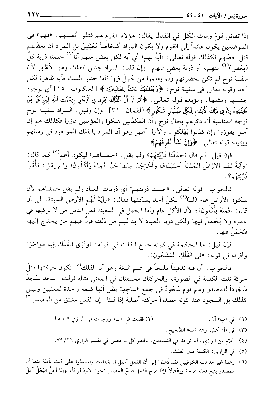 فالجواب: أن فيه تدقيقاً مليحاً في علم اللغة وهو أن الفلك تكون حركتها مثلَ حركة تلك الكلمة في الصورة، والحركتان مختلفنان في المعنى مثاله قولك: سَجَد يَسْجُدُ سُجُوداً للمصدر وهم قوم سُجُودٌ في جمع «سَاجِدٍ» يظن أنها كلمة واحدة لمعنيين وليس كذلك بل السجود عند كونه مصدراً حركته أصلية إذا قلنا: إن الفعل مشتق من المصدر