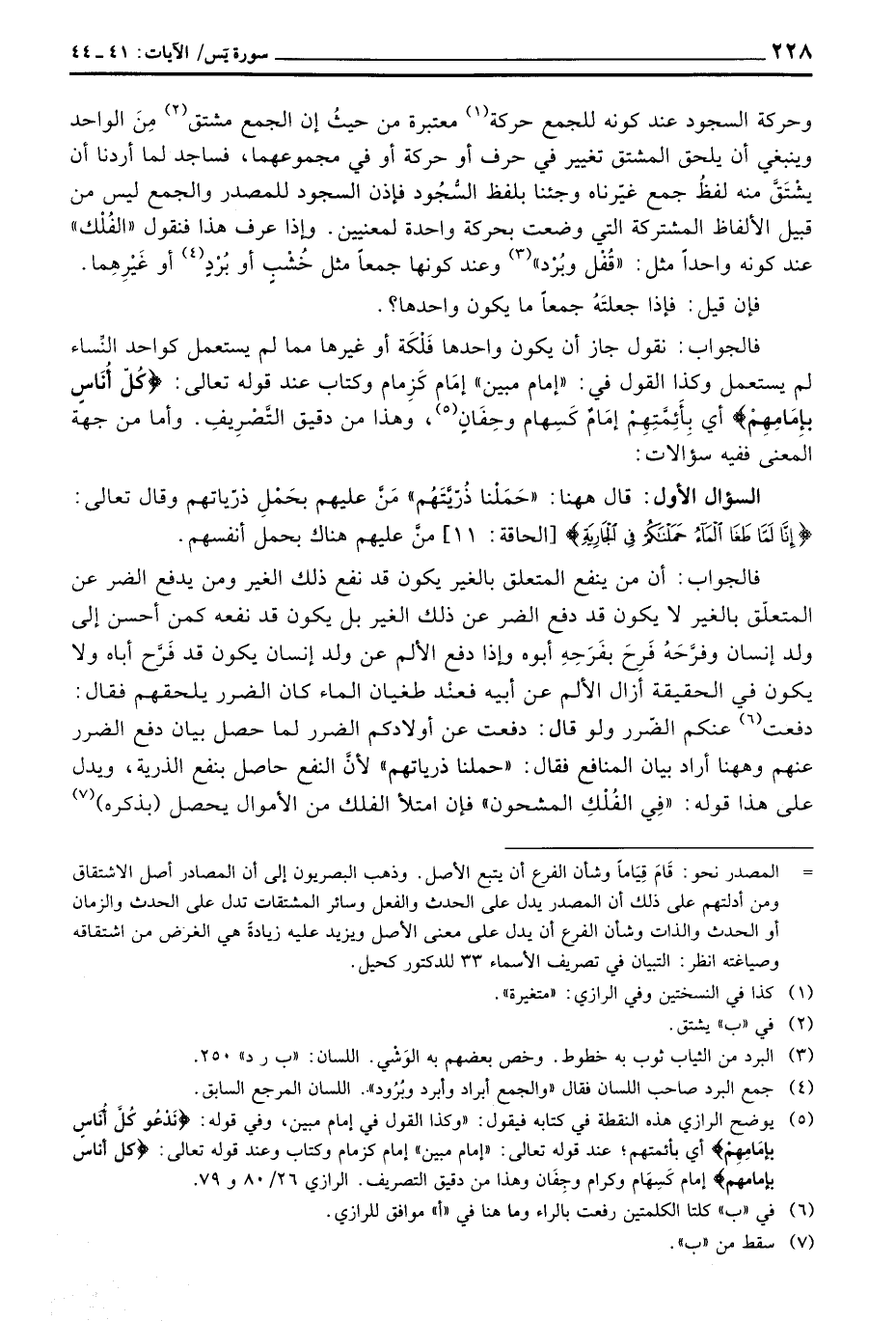 فالجواب: نقول جاز أن يكون واحدها فَلْكَة أو غيرها مما لم يستعمل كواحد النِّساء لم يستعمل وكذا القول في: «إمام مبين» إمَام كَزِمام وكتاب عند قوله تعالى: {كُلَّ أُنَاسٍ بِإِمَامِهِمْ} [الإسراء: 71] أي بِأَئِمَّتِهِمْ إمَامٌ كَسِهام وحِفَانٍ، وهذا من دقيق التَّصْرِيف. وأما من جهة المعنى ففيه سؤالات: