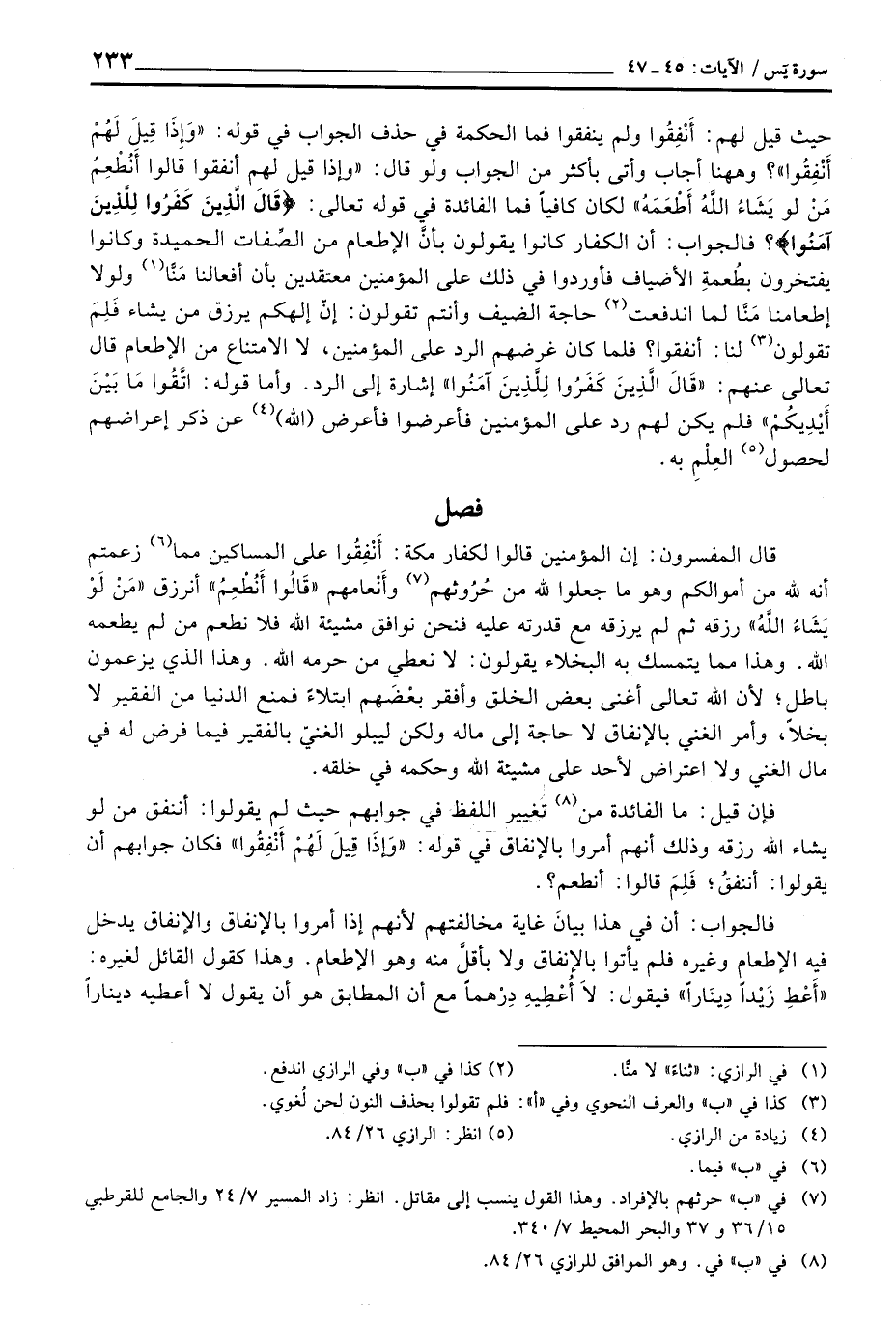 حيث قيل لهم: أَنْقِقُوا ولم ينفقوا فما الحكمة في حذف الجواب في قوله: {وَإِذَا قِيلَ لَهُمْ أَنفِقُواْ} وههنا أجاب وأتى بأكثر من الجواب ولو قال:» وإذا قيل لهم أنققوا قالوا أنْطْعِمُ مَنْ لو يَشَاءُ اللَّهُ أَطْعَمَهُ «لكان كافياً فما الفائدة في قوله تعالى: {قَالَ الذين كَفَرُواْ لِلَّذِينَ آمنوا} فالجواب: أن الكفار كانوا يقولون بأنَّ الإطعام من الصِّفات الحميدة وكانوا يفتخرون بطُعمةِ الأضياف فأوردوا في ذلك على المؤمنين معتقدين بأن أفعالنا مَنًّا ولولا إطعامنا مَنَّا لما اندفعت حاجة الضيف وأنتم تقولون: إنّ إلهكم يرزق من يشاء فَلِمَ تقولون لنا: أنفقوا؟ فلما كان غرضهم الرد على المؤمنين، لا الامتناع من الإطعام قال تعالى عنهم: {قَالَ الذين كَفَرُواْ لِلَّذِينَ آمنوا} إشارة إلى الرد.