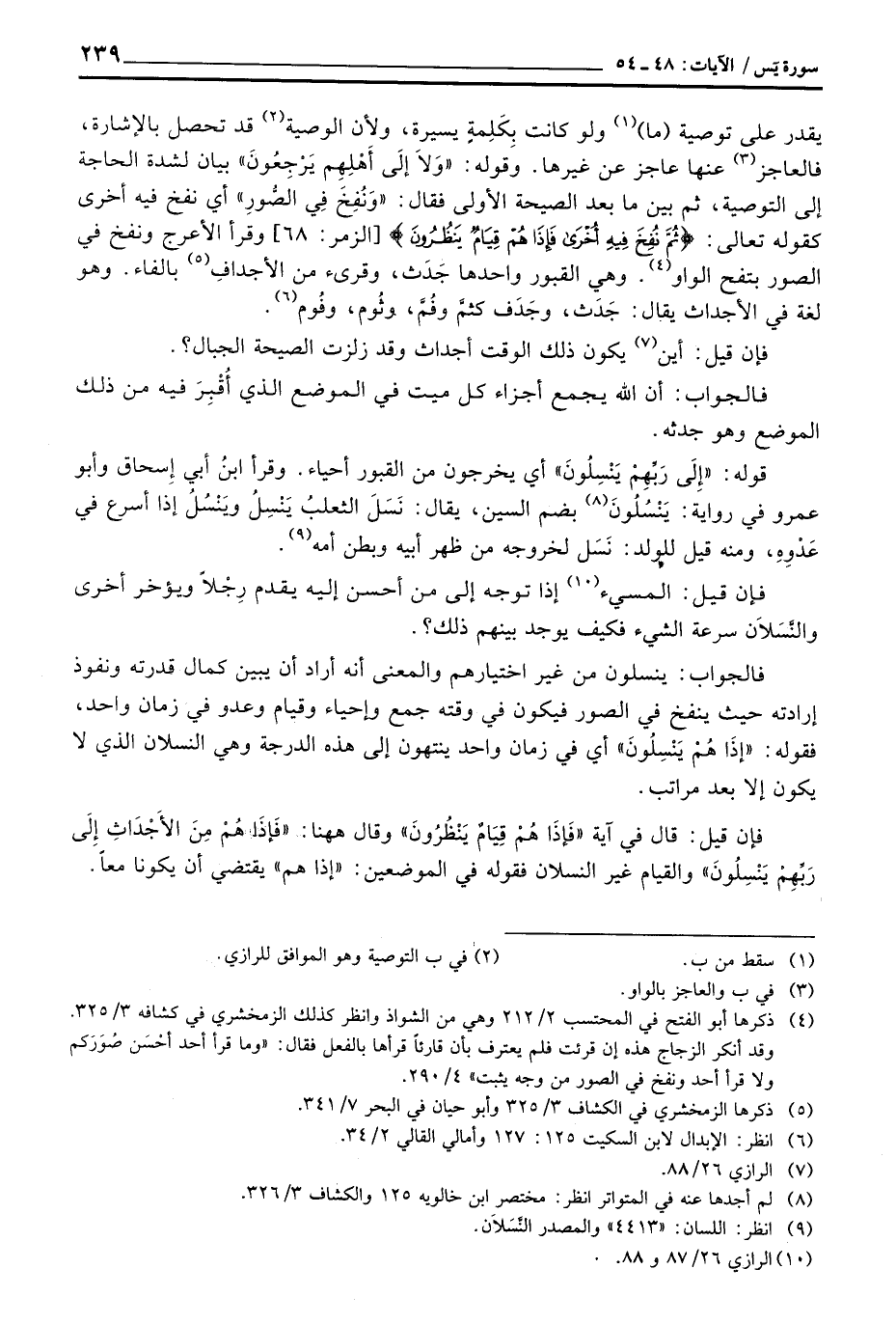 يقدر على توصية (ما) ولو كانت بِكَلِمةٍ يسيرة، ولأن الوصية قد تحصل بالإشارة، فالعاجز عنها عاجز عن غيرها. قوله: {إلى أَهْلِهِمْ يَرْجِعُونَ} بيان لشدة الحاجة إلى التوصية، ثم بين ما بعد الصيحة الأولى فقال: {وَنُفِخَ فِي الصور} أي نفخ فيه أخرى كقوله تعالى: {ثُمَّ نُفِخَ فِيهِ أخرى فَإِذَا هُمْ قِيَامٌ يَنظُرُونَ} [الزمر: 68] وقرأ الأعرج ونفخ في الصور بتفح لاواو وهي القبور واحدها جَدَث، وقرئ من الأجدافِ بالفاء، وهو لغة في الأجداث يقال: جَدَث، وجَدَف كثمَّ وفُمَّ، وثُوم، وفُوم.