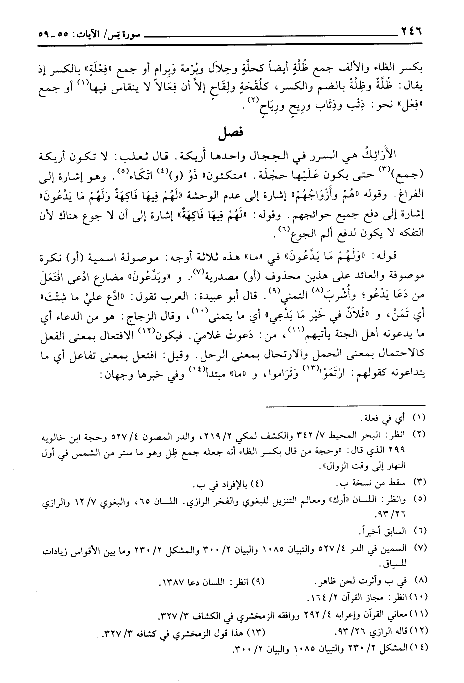 الأَرَائِكُ هي السرر في الحِجال واحدها أًريكة. قال ثعلب: لا تكون أريكة (جمع) حتى يكون عَلَيْها حجْلة. «متكئون» ذَوْ (و) اتّكَاء وهو إشارةإلى الفراغ. وقوله «هُمْ وأَزْوَاجُهُمْ» إشارة إلى عدم الوحشة {هُمْ وَأَزْوَاجُهُمْ} إشارة إلى دفع جميع حوائجهم وقوله: {لَهُمْ فِيهَا فَاكِهَةٌ وَلَهُمْ مَّا يَدَّعُونَ} إشارة إلى أن لا جوع هناك لأن التفكه لا يكون لدفع ألم الجوع.