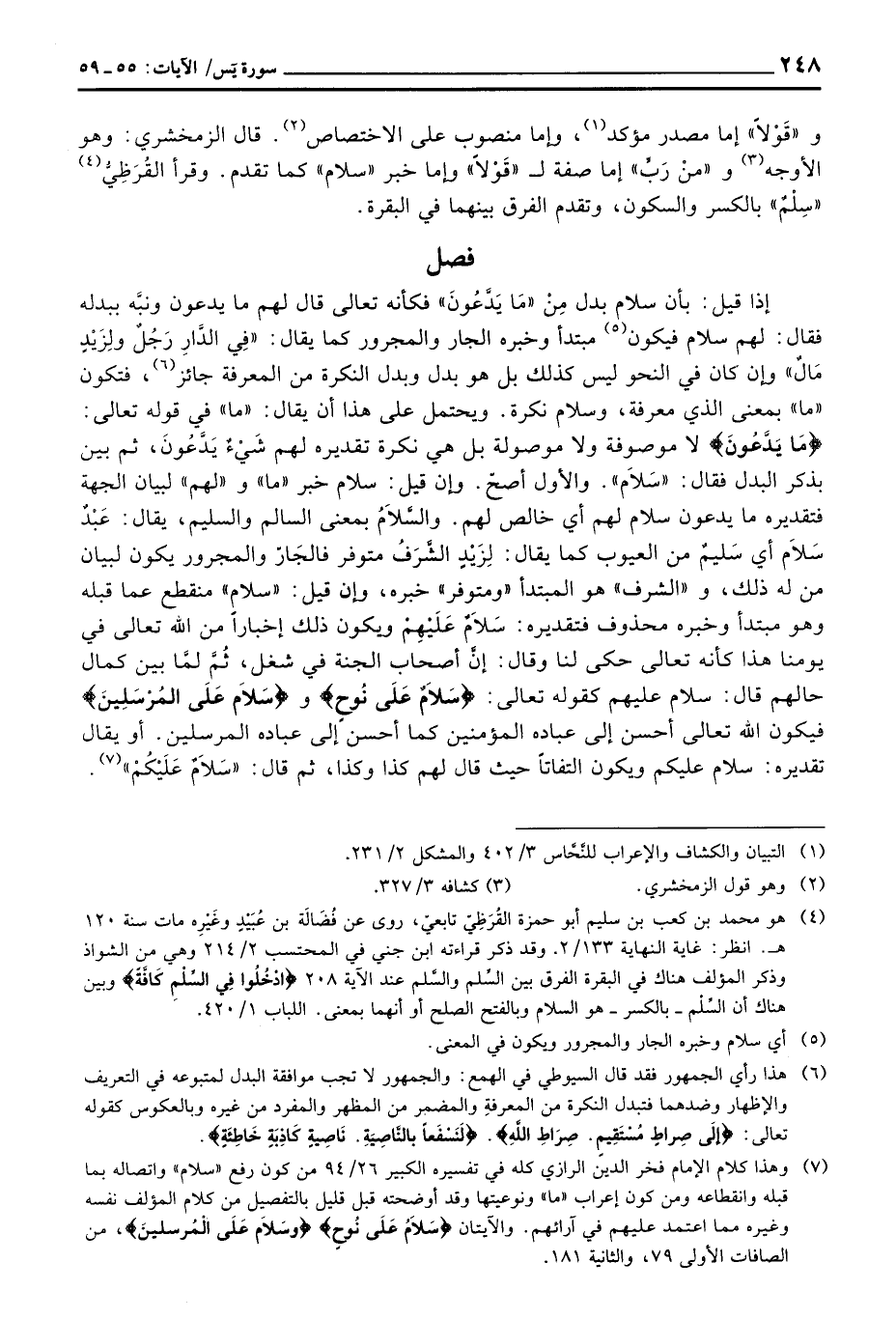 إذا قيل: بأن سلام بدل مِنْ «مَا يَدَّعُونَ» فكأنه تعالى قال لهم ما يدعون نبَّه ببدله فقال: لهم سلام فيكون مبتدأ وخبره الجار والمجررو كا يقال: «فِي الدَّارِ رَجُلٌ ولِزَيْدٍ مَالٌ» وإن كان في النحو ليس كذلك بل هو بدل وبدل النكرة م المعرفة جائز، فتكون «ما» بمعنى الذي معرفة، وسلام نكرة. ويحتمل على هذا أن يقال: «ما» في قوله تعالى: {مَّا يَدَّعُونَ} لا موصوفة ولا موصولة بل هي نكرة تقديره لهم شَيْءٌ يَدَّعُونَ، ثم بين بذكر البدل فقال: «سَلاَم» والأول أصحّ. وإن قيل: سلام خبر «ما» و «لهم» لبيان الجهة فتقديره ما يدعون سلام لهم أي خالص لهم. والسَّلاَمُ بمعنى السالم والسليم، يقال: عَبْدٌ سَلاَم أي سليمٌ من العيوب كما يقال: لِزَيْدٍ الشَّرَفُ متوفر فالجَارّ والمجرور يكون لبيان من له ذلك، «والشرف» هو المبتدأ «ومتوفر» خبره، وإن قيل: «سلام» منقطع عما قبله وهو مبتدأ وخبره محذوف فتقديره: سَلاَمٌ عَلَيْهِمْ ويكون ذلك إخباراً من الله تعالى في يومنا هذا كأنه تعالى حكى لنا وقال: إنَّ أصحاب الجنة في شغل، ثُمَّ لمَّا بين كمال حالهم قال: سلام عليهم كقوله تعالى: {سَلاَمٌ على نُوحٍ} [الصافات: 79] و {وَسَلاَمٌ على المرسلين} [الصافات: 81] فيكون الله تعالى أحسن إلى عباده المؤمنين كما أحسن إلى عباده المرسلين. أو يقال تقديره: سلام عليكم ويكون التفاتاً حيث قال لهم كذا وكذا، ثم قال: {سَلاَمٌ عَلَيْكُمْ} [الأنعام: 54]