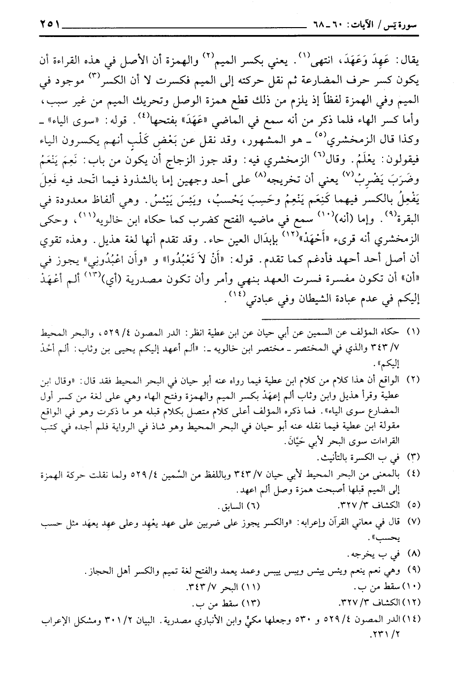 يقال: عَهِدَ وَعَهَدَ، انتهى يعني بكسر الميم والهمزة أن الأصل في هذه القراءة أن يكون كسر حرف المضارعة ثم نقل حركته إلى الميم فكسرت لا أن الكسر موجود في الميم وفي الهمزة لفظاً إذ يلزم من ذلك قطع همزة الوصل وتحريك الميم من غير سبب، وأما كسر الهاء فلما ذكر من أنه سمع في الماضي «عَهَدَ» فتحها قوله: «سوى الياء» - وكذا قال الزمخشري - هو المشهور، وقد نقل عن بَعْضِ كَلْبٍ أنهم يكسرون الياء فيقولون: يعْلَمُ وقال الزمخشري فيه: وقد جوز الزجاج أن يكون من باب: نَعِمَ يَنْعَمُ وضَرَبَ يَضْرِبُ يعني أن تخريجه على أحد وجهين إما بالشذوذ فيما اتّحد فيه فَعِلَ يَفْعِلُ بالكسر فيهما كَنِعَم يَنْعِمُ وحَسِبَ يَحْسبُ، ويَئِسَ يَيْئسُ. وهي ألفاظ معدودة في البقرة وإما (أنه) سمع في ماضيه الفتح كضرب كما حكاه ابن خالويه وحكى الزمخشري أنه قرئ «أَحْهَدْ» بإبدَال العين حاء. وقد تقدم أنها لغة هذيل. وهذه تقوي أن أصل أحد أحهد فأدغم كما تقدم. قوله: {أَن لاَّ تَعْبُدُواْ} و {وَأَنِ اعبدوني} يجوز في «أن» أن تكون مفسرة فسرت العهد بنهي وأمر وأن تكون مصدرية (أي) ألم أعْهَدْ إليكم في عدم عبادة الشيطان وفي عبادتي.