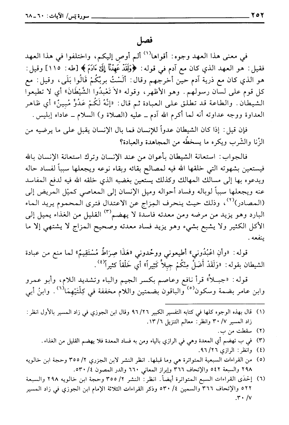قوله: {وَأَنِ اعبدوني} أطيعوني ووحِّدوني {هذا صِرَاطٌ مُّسْتَقِيمٌ} ما منع من عبادة الشيطان بقوله {وَلَقَدْ أَضَلَّ مِنْكُمْ جِبِلاًّ كَثِيراً} أي خَلْقاً كثيراً.