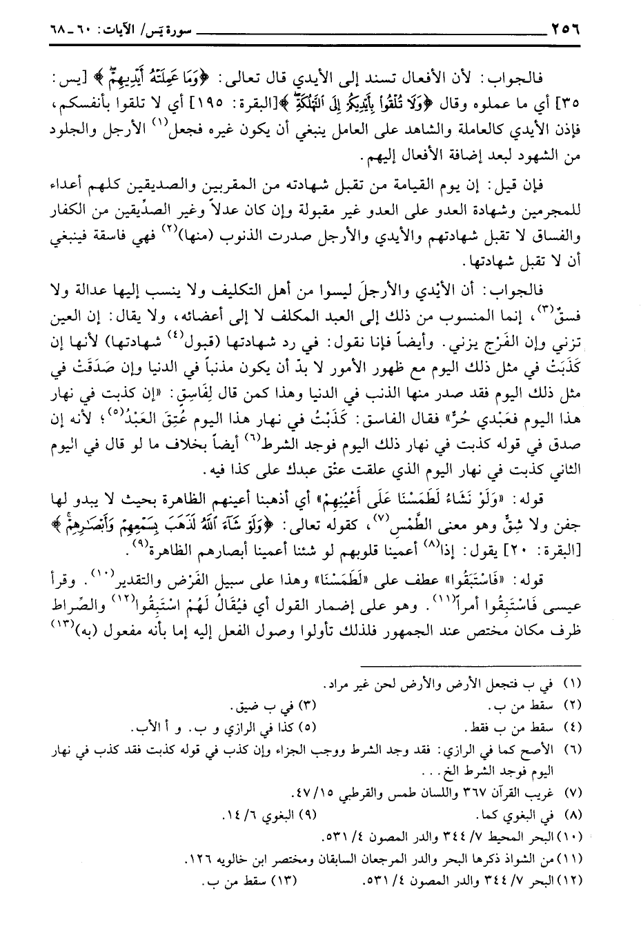 فالجواب: أن الأيْدي والأرجلَ ليسوا من أهل التكليف ولا ينسب إلهيا عدالة ولا فسقٌ، إنما المنسوب من ذلك إلى العبد المكلف لا إلى أعضائه، ولا يقالك إن العين تزني إن الفَرْج يزني وأيضاً فإنا نقلو: في در شهادتها (قبول شهادتها) لأنها إن كَذَبَتْ في مثل ذلك اليوم مع ظهور الأمور لا بدّ أن يكون مذنباً في الدينا وإن صَدَقَتْ في مثل ذلك اليوم فقد صدر منها الذنب في الدنيا وهذا كن قال لِفَاسِق: «إن كذبت في نهار هذا اليوم فعَبْدي حُرٌّ» فقال الفاسق: كَذَبْتُ في نهار هذا اليوم عُتِقَ العَبْدُ؛ لأنه إن صدق في قوله كذبت في نهار ذلك اليوم فوجد االشرط أيضاً بخلاف ما لو قال في لايوم الثاني كذبت في نهار اليوم الذي علقت عتْق عبدك على كذا فيه.