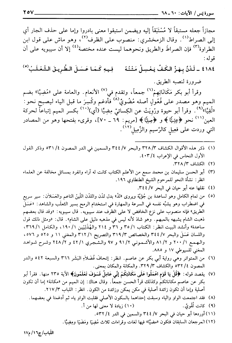 وقرأ أبو بكر مَكَانَاتِهِمْ جمعاً، وتقدم في الأنعام. والعامة على «مُضِيًّا» بضم الميم وهو مصدر على فُعُولٍ أصله مُضُويٌ فأدغم وكُسِرَ ما قبل الياء ليصبح نحو «لُقِيًّا» وقرأ أبو حيوة ورُويَتْ عن الكِسائيِّ مِضِيًّا (أي) بكسر الميم إتباعاً لحركة العين نحو {عِتِيّاً} و {صِلِيّاً} [مريم: 69 - 70] وقرئ بفتحها وهو من المصارد التي وردت على فعِيلٍ كالرِّسيم والزَّمِيلِ.