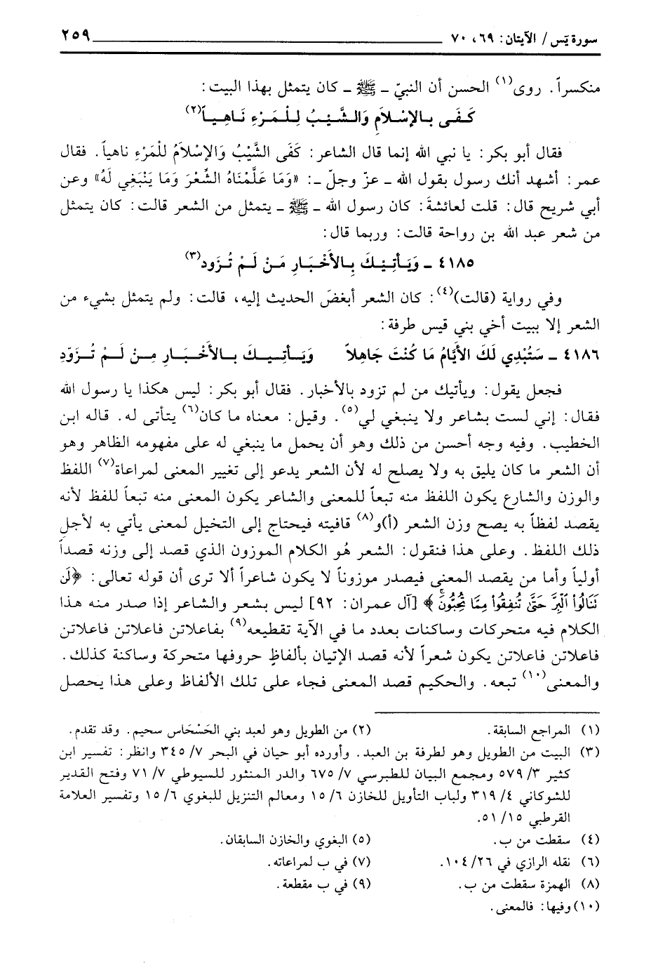 فجعل يقول: ويأتيك من لم تزود بالأخبار. فقال أبو بكر: ليس هكذا يا رسول الله فقال: إني لست بشاعر ولا ينبغي لي وقيل: معناه ما كان يتأتى له قال ابن الخطيب وفيه وجه أحسن من ذلك وهو أن يحمل ما ينبغي له على مفهومه الظاهر وهو أن الشعر ما كان يليق به ولا يصلح له لأن الشعر يدعو إلى تغيير المعنى لمراعاة اللفظ والوزن والشارع يكون اللفظ منه تبعاً للمعنى والشاعر يدعو إلى تغيير المعنى لمراعاة اللفظ والوزن والشارع يكون اللفظ منه تبعاً للمعنى والشاعر يكون المعنى منه تبعاً للفظ لأنه يقصد لفظاً به يصح وزن الشعر (أ) وقافيته فيحتاج إلى التخيل لمعنى يأتي به لأجل ذلك اللفظ. وعلى هذا فنقول: الشعر هُو الكلام الموزون الذي قصد إلى وزنه قصداً أولياً وأما من يقصد المعنى فيصدر موزوناً لا يكون شاعراً ألا ترى أن قوله تعالى: {لَن تَنَالُواْ البر حتى تُنْفِقُواْ مِمَّا تُحِبُّونَ} [آل عمران: 92] ليس بشعر والشاعر إذا صدر منه هذا الكلام فيه متحركات وساكنات بعدد ما في الآية تقطعيه بفعلاتن فاعلاتن فاعلاتن فاعلاتن فاعلاتن يكون شعراً لأنه قصد الإتيان بألفاظٍ حروفها متحركة وساكنة كذلك. والمعنى تبعه والحكيم قصد المعنى فجاء على تلك الألفاظ وعلى هذا يحصل