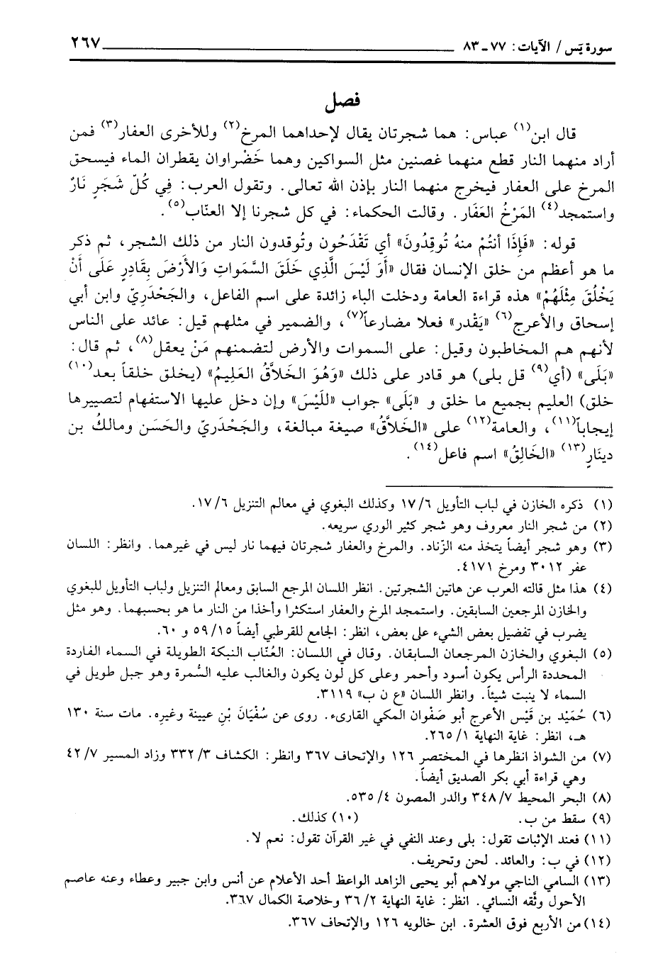 قوله: {فَإِذَآ أَنتُم مِّنْه تُوقِدُونَ} أي تَقْدحُون وتُوقدون النار من ذلك الشجر، ثم ذكر ما هو أعظم من خلق الإنسان فقال {أَوَلَيْسَ الذي خَلَقَ السماوات والأرض بِقَادِرٍ على أَن يَخْلُقَ مِثْلَهُم} هذه قراءة العامة ودخلت الباء زائدة على اسم الفاعل، والجَحْدَرِيّ وابن أبي إسحاق والأعرج «يَقْدر» فعلاً مضارعاً والضمير لتضمنهم مَنْ يعقل ثم قال: «بلى» (أي قل بلى) هو قادر على ذلك {وَهُوَ الخلاق العليم} (يخلق خلقاً بعد خلق) العليم بجميع ما خلق و «بَلَى» جواب «للَيْسَ» وإن دخل عليها الاستفهام لتصيرها إيجاباً والعامة على «الخَلاَّقُ» صيغة مبالغة، والجَحْدَريّ والحَسَن ومالكُ بن دينَارٍ «الخَالِقُ» اسم فاعل.