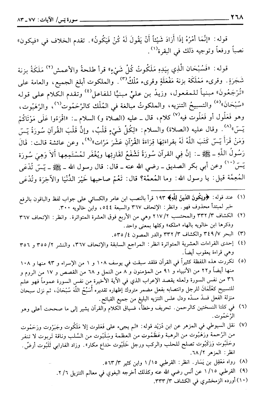 قوله: {فَسُبْحَانَ الذي بِيَدِهِ مَلَكُوتُ كُلِّ شَيْءٍ} قرأ طلحةُ والأعمش مَلَكَةُ بزنة شَجَرَةٍ. وقرئ مَمْلَكَة بزنة مَفْعَلَةٍ وقرئ مُلْكُ والملكوت أبلغ الجميع، والعامة على «تُرْجَعُونَ» مبنياً للمفعول، وزيدُ بن عليِّ مبنيًّا للفاعل وتقدم الكلام على قوله «سُبْحَانَ» والتسبيحُ التنزيه، والمكوتُ مبالغة في المُلْك كالرَّحَمُوت والرَّهَبُوت، وهو فَعَلُول أو فَعلَلُوت فيه كلام، قال - عليه (الصلاة و) السلام -: «اقْرَءُوا عَلَى مَوْتَاكُمْ يس» وقال عليه (الصلاة و) السلام: «لِكُلِّ شَيْءٍ قَلْبٌ، وإنَّ قَلْبَ القُرآنِ سُورَةُ يس وَمنْ قَرَأ يس كَتَب اللَّهُ لَهُ بقراءَتِهَا قِرَاءَةَ القُرْآنِ عَشْرَ مَرَّات» وعن عائشة قالت: «قَالَ رَسُولُ اللَّهِ - صَلَّى اللَّهُ عَلَيْهِ وَسَلَّم َ -: إنَّ فِي القرآن سُورَةً تَشْفَعُ لقَارِئها ويُغْفَر لمُسْتَمِعِها أَلاَ وِهِيَ سُورَة يس» وعن أبي بكر الصديق - رَضِيَ اللَّهُ عَنْه - قال: «قال رسول الله - صَلَّى اللَّهُ عَلَيْهِ وَسَلَّم َ - يس تُدْعَى المُعِمَّة قيل: يا رسول الله: وما المُعمَّة؟ قال: تَعُمّ صاحبها خَيْرَ الدُّنْيَا والآخِرَة وتُدْعَى