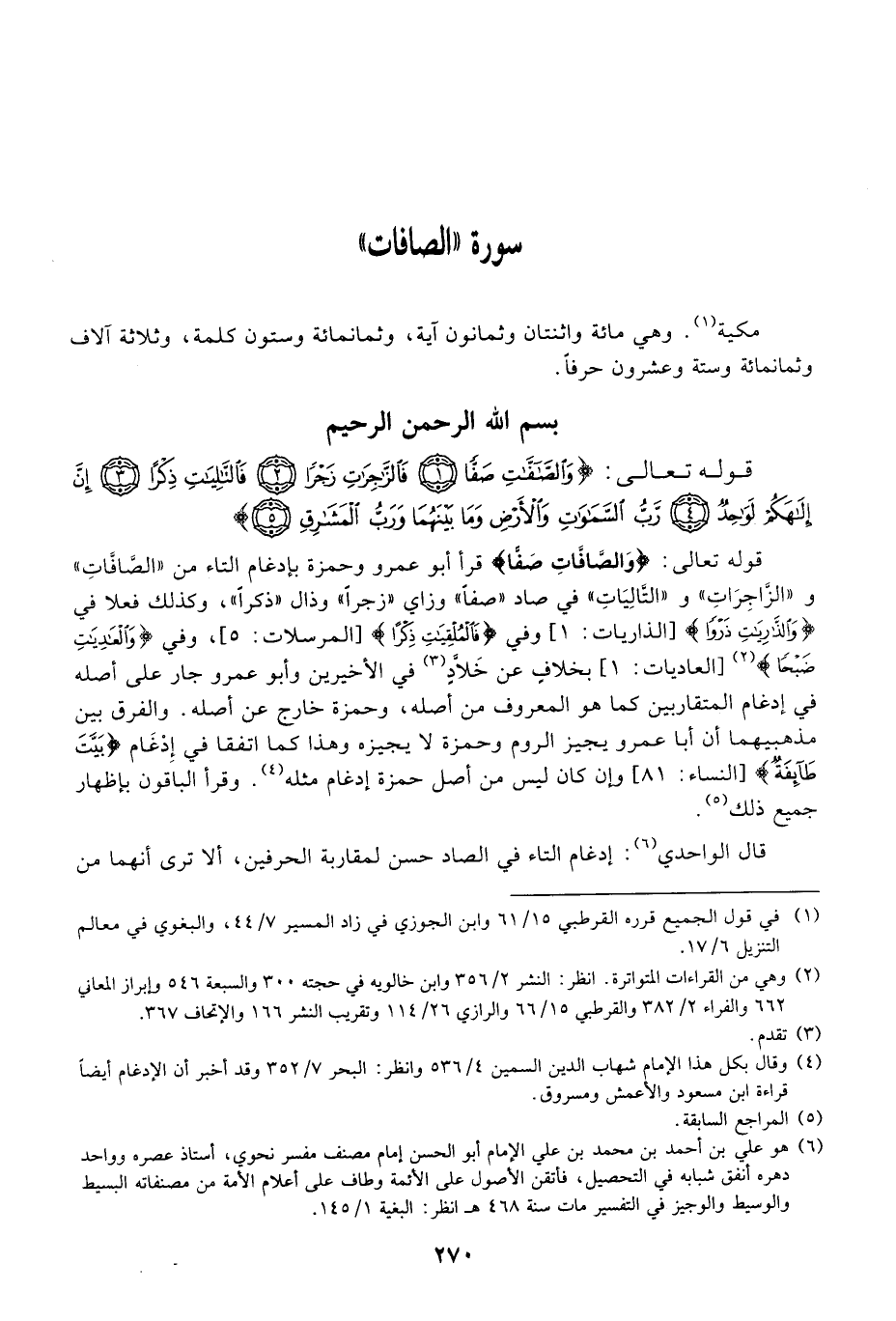 قوله تعالى: {والصافات صَفَّا} قرأ أبو عمرو وحمزة بإدغام التاء من «الصَّافَّاتِ» و «الزَّاجرَاتِ» و «التَّاليَاتِ» في صاد «صفاً» وزاي «زجراً» وذال «ذكراً» وكذلك فعلا في {والذاريات ذَرْواً} [الذاريات: 1] وفي {فالملقيات ذِكْراً} [المرسلات: 5] ، وفي {والعاديات ضَبْحاً} [العاديات: 1] بخلافٍ عن خَلاَّدٍ في الأخيرين وأبو عمرو جار على أصله في إدغام المتقاربين كما هو المعروف من أصله وحمزة خارج عن أصله والفرق بين مذهبيهما أن أبا عمرو يجيز الروم وحمزة لا يجيزه وهذا كما اتفقا في إدْغَام {بَيَّتَ طَآئِفَةٌ} [النساء: 81] وإن كان ليس من أصل حمزة إدغام مثله وقرأ الباقون بإظهار جميع ذلك.