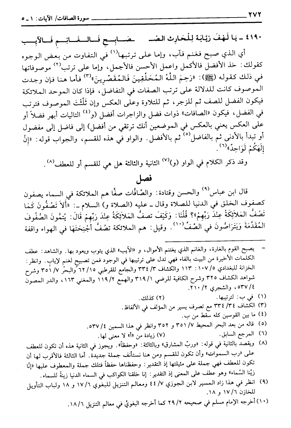 أي الذي صبح فغنم فآب، وإما على ترتبها في التفاوت من بعض الوجوه كقولك: خذ الأفضل فالأكمل واعمل الأحسن فالأجمل، وإما على ترتب موصوفاتها في ذلك كقوله (صَلَّى اللَّهُ عَلَيْهِ وَسَلَّم َ) : «رَحِمَ اللَّهُ المُحَلِّقِينَ فَالمُقَصِّرِينَ» فأما هنا فإن وجدت الموصوف كانت للدلالة على ترتب الصفات في التفاضل، فإذا كان الموحد الملائكة فيكون الفضل للصف ثم للزجر، ثم للتلاوة وعلى العكس وإن ثَلَّثْتَ الموصوف فترتب في الفضل، فيكون «الصافات» ذوات فضل والزجرات أفضل (والتاليات أبهر فضلاً أو على العكس يعني بالعكس فيال موضعين أنك ترتقي من أفضل) إلى فاضل إلى مفضول أو تبدأ بالأدنى ثم بالفاضل ثم بالأفضل.