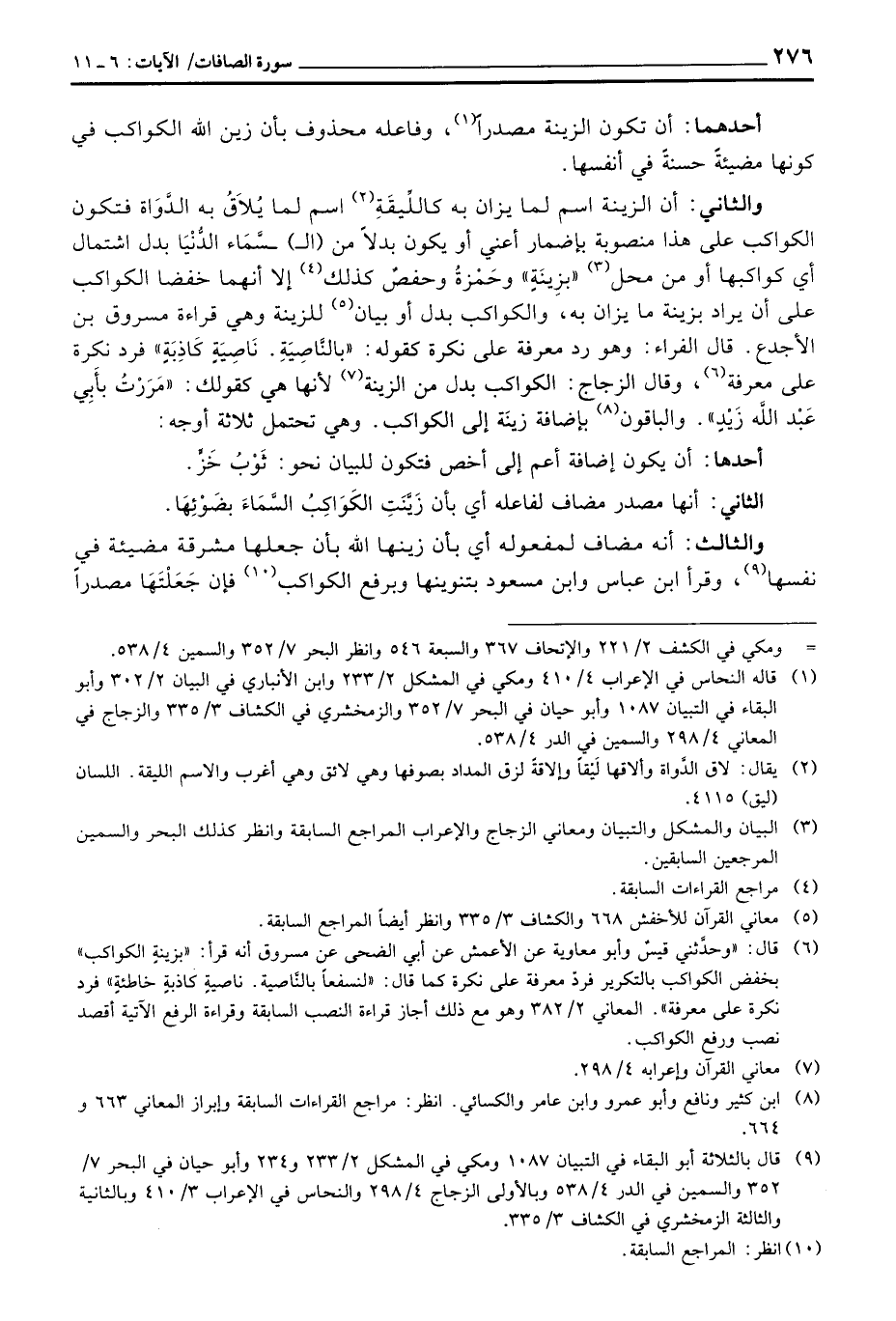 والثاني: أن الزينة اسم لما يزان به كاللِّيقَةِ اسم لما يُلاَقُ به الدَّوَاة فتكون الكواكب على هذا منصوبة بإضمار أعني أو يكون بدلاً من (ال) سَّمَاء الدُّنْيَا بدل اشتمال أي كواكبها أو من محل «بزينَةٍ» وحَمْزةُ وحفصٌ كذلك إلا أنهما خفضا الكواكب على أن يراد بزينة ما يزان به، والكواكب بدل أو بيان للزينة وهي قراءة مسروق بن الأجدع قال الفراء: وهو رد معرفة على نكرة كقوله: «بالنَّاصِيَةِ نَاصِيَةٍ كَاذِبَةٍ» فرد نكرة على معرفة وقال الزجاج: الكواكب بدل من الزينة لأنها هي كقولك: «مَرَرْتُ بأَبِي عَبْد اللَّه زَيْدٍ» والباقون بإضالة زينَة إلى الكواكب وهي تحتمل ثلاثة أوجه: