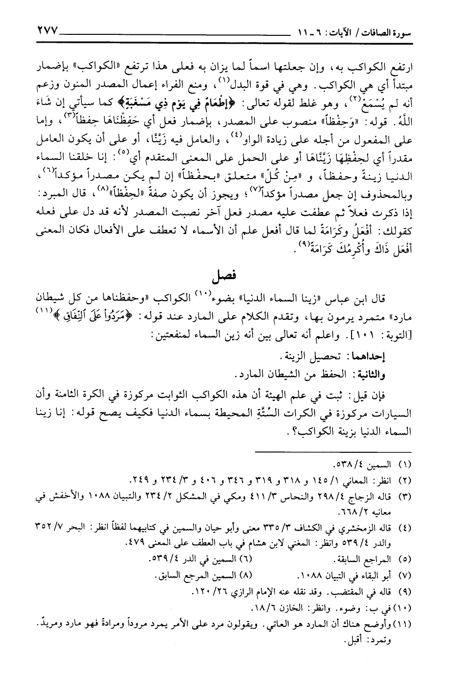 ارتفع الكواكب به، وإن جعلتها اسماً لما يزان به فعلى هذا ترفتع «الكواكب» بإضمار مبتدأ أي هي الكواكب. وهي في قوة البدل ومنع الفراء إعمال المصدر المنون ورغم أنه لم يُسْمعْ وهو غلط لقوله تعالى: {أَوْ إِطْعَامٌ فِي يَوْمٍ ذِي مَسْغَبَةٍ} [البلد: 14] كما سيأتي إن شَاءَ اللَّهُ. قوله: «وَحِفْظاً» منصوب على المصدر، بإضمار فعل أي حَفِظْنَاهَا حِفظاً، وإما على المفعول من أجله على زيادة الواو والعامل فيه زَيَّنَّا أو على أن يكون العامل مقدراً أي لحِفْظِهَا زَيَّنَّا أو على الحمل على المعنى المتقدم أي: إنا خلقنا السماء الدينا زينةً وحفظاً، و «مِنْ كُلّ» ويجوز أن يكون صفةً «لِحفْظاً» قال المبرد: إذا ذكرت فعلاً ثم عطفت عليه مصرد فعل آخر نصبت المصدر لأنه قد دل على فعله كقولك: أفْعَلُ وكَرَامَةً لما قال أفعل علم أن الأسماء لا تعطف فكان المعنى أفْعَل ذَاكَ واُكْرِمُكَ كَرَامَةً.