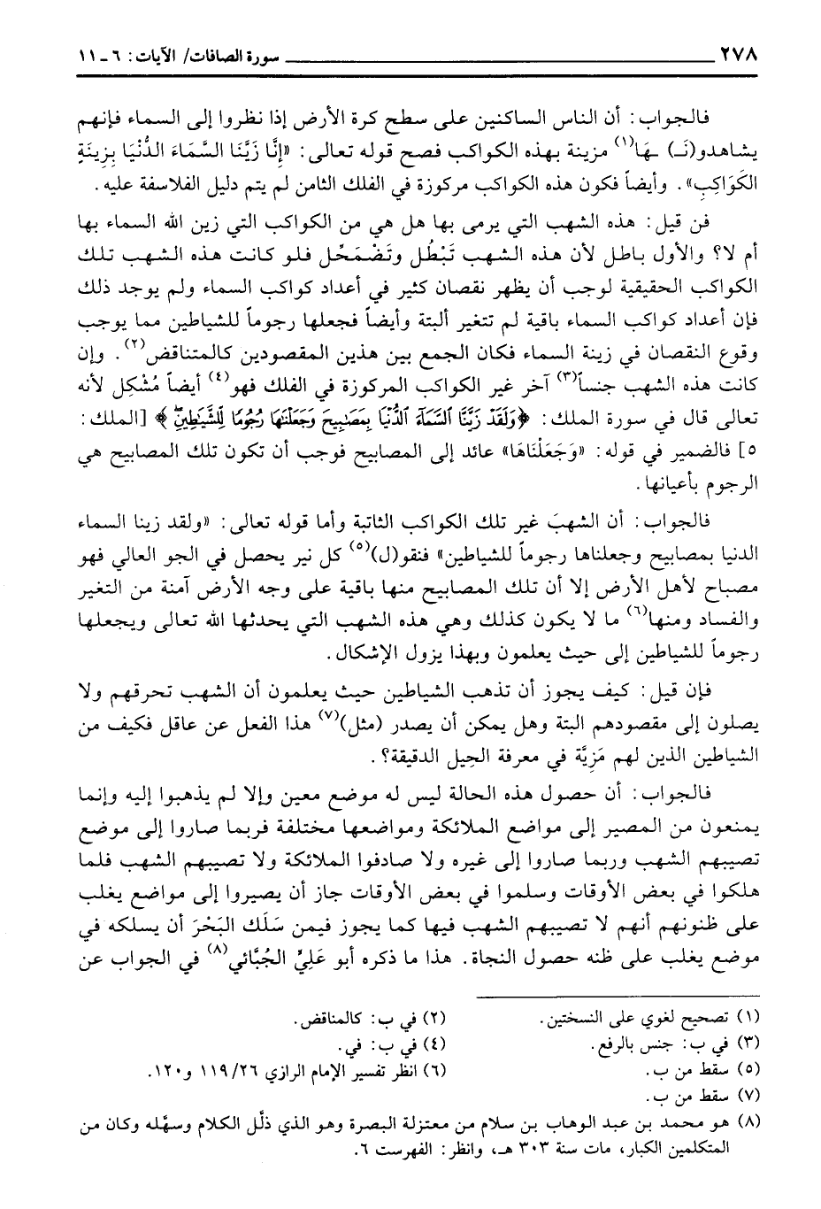 فالجواب: أن الشهبَ غير تلك الكواكب الثاتبة وأما قوله تعالى: «ولقد زينا السماء الدنيا بمصابيح وجعلناها رجوماً للشياطين» فنقو (ل) كل نير يحصل في الجو العالي فهو مصباح لأهل الأرض إلا أن تلك المصابيح منها باقية على وجه الأرض آمنة من التغير والفساد ومنها ما لا يكون كذلك وهي هذه الشهب التي يحدثها الله تعالى ويجعلها رجوماً للشياطين إلى حيث يعلمون وبهذا يزول الإشكال.