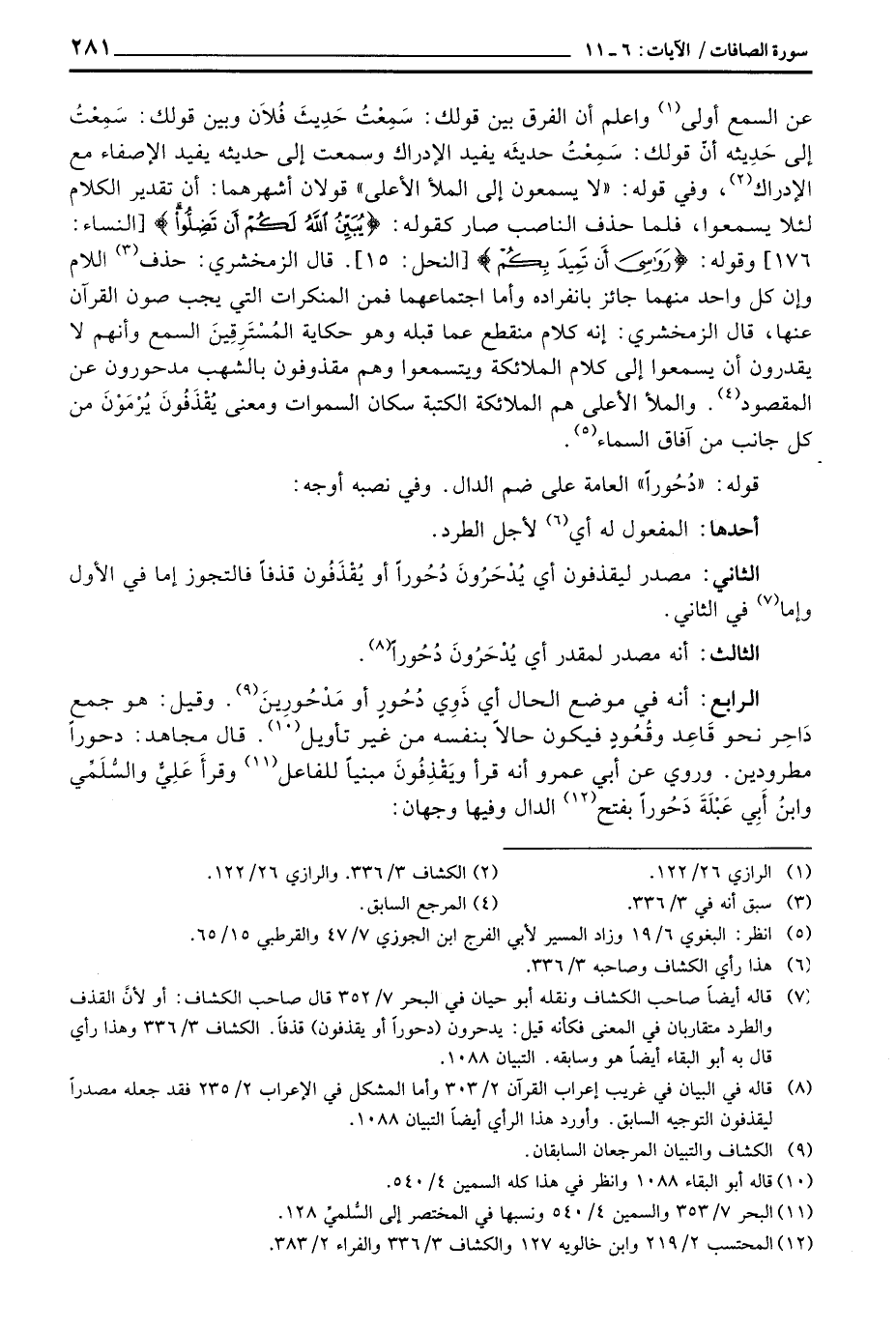 عن السمع أولى واعلم أن الفرق بين قوله: سَمِعْتُ حَدِيثَ فُلاَن وبين قولك: سمِعْتُ إلى حَدِيثه أنّ قولك: سِمِعْتُ حديثَه يفيد الإدراك وسمعت إلى حديثه يفيد الإصفاء مع الإدراك وفي قوله: «لا يسمعون إلى الملأ الأعلى» قولان أشهرهما: أن تقدير الكلام لئلا يسمعوا، فلما حذف الناصب صار كقوله: {يُبَيِّنُ الله لَكُمْ أَن تَضِلُّواْ} [النساء: 176] وقوله: {رَوَاسِيَ أَن تَمِيدَ بِكُمْ} [النحل: 15] قال الزمخشري: حذف اللام وإن كل واحد منهما جائز بانفراده وأما اجتماعهما فمن المنكرات التي يجب صون القرآن عنها، قال الزمخشري: إنه كلام منقطع عما قبله وهو حكاية المُسْتَرِقِينَ السمع وأنهم لا يقدرون أن يسمعوا إلى كلام الملائكة ويسمعوا وهم مقذوفون بالشهب مدحورون عن المقصود. والملأ الأعلى هم الملائكة الكتبة سكان السموات ومعنى يُقْذَفُونَ يُرْمَوْنَ من كل جانب من آفاق السماء.
