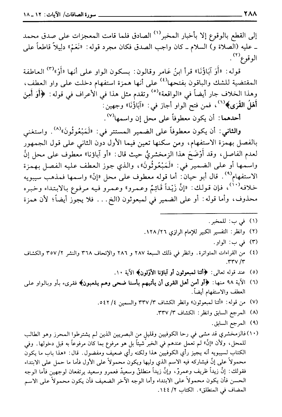 والثاني: أن يكون معطوفاً على الضمير المستتر في: «لَمَبْعُوثُونَ» واستغني بالفصل بهمزة الاستفهام، ومن سكنها تعين فيما الأول دون الثاني على قول الجمهور لعدم الفاصل، وقد أَوْضَحَ هذا الزمخشريُّ حيث قال: «أو آباؤنا» معطوف على محل إنَّ واسمها أو على الضمير في: «لَمَبْعُوثُونَ» والذي جوز العطف عليه الفصل بهمزة الاستفهام قال أبو حيان: أما قوله معطوف على محل «إنّ» واسمها فمذهب سيبويه خلافه فإن قولك: «إنَّ زَيْداً قَائِمٌ وعمرو» وعمرو فيه مرفوع بالابتداء وخبره محذوف، وأما قوله: أو على الضمير في لمبعوثون (الخ ...