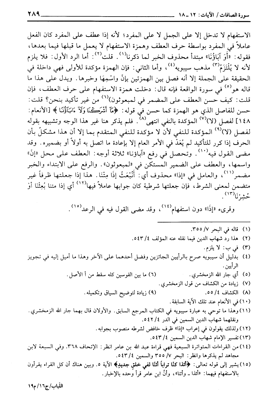 الاستفهام لا تدخل إلى على الجمل لا على المفرد؛ لأنه إذا عطف على المفرد كان الفعل عاملاً في المفرد بواسطة حرف العطف وهمزة الاستفهام لا يعمل ما قبلها فيما بعدها، فقوله: {أَوَ آَبَاؤُنَا} مبتدأ محذوف الخبر لما ذكرنا قلت: أما الرد الأول: فلا يلزم لأنه لا يُلْتَزَمُ مذهب سيبويه وأما الثاني: فإن الهمزة مؤكدة للأولى فهي داخلة في الحقيقة على الجملة إلا أنه فصل بين الهمزتين بإنّ واسْمِهَا وخبرها. ويدل على هذا ما قاله هو في سورة الواقعة فإنه قال: دخلت همزة الاستفهام على حرف العطف، فإن قلت: كيف حسن العطف على المضمر في لمبعوثون) من غير تأكيد بنحن؟ قلت: حسن للفاصل الذي هو الهمزة كما حسن في قوله: {مَآ أَشْرَكْنَا وَلاَ آبَاؤُنَا} [الأنعام: 148] لفصل (لا) المؤكدة للنفي لأن لا مؤكدة للنفي المتقدم بما إلا أن هذا مشكلٌ بأن الحرف إذا كرر للتأكيد لم يُعَدْ في الأمر العام إلا بإعادة ما اتصل به أولاً أو بضميره. وقد مضى القول فيه وتحصل في رفع «آباؤنا» ثلاثة أوجه: العطف على الابتداء والخبر مضمر والعامل في «إذا» محذوف أي: أَنُبْعَثُ إذَا مِتْنَا هذا غذا جعلتها ظرفاً غير متضمن لمعنى الشرط، فإن جعلتها شرطية كان جوباها عاملاً فيها أي إذا متنا بُعِثْنَا أوْ حُشِرْنَا.
