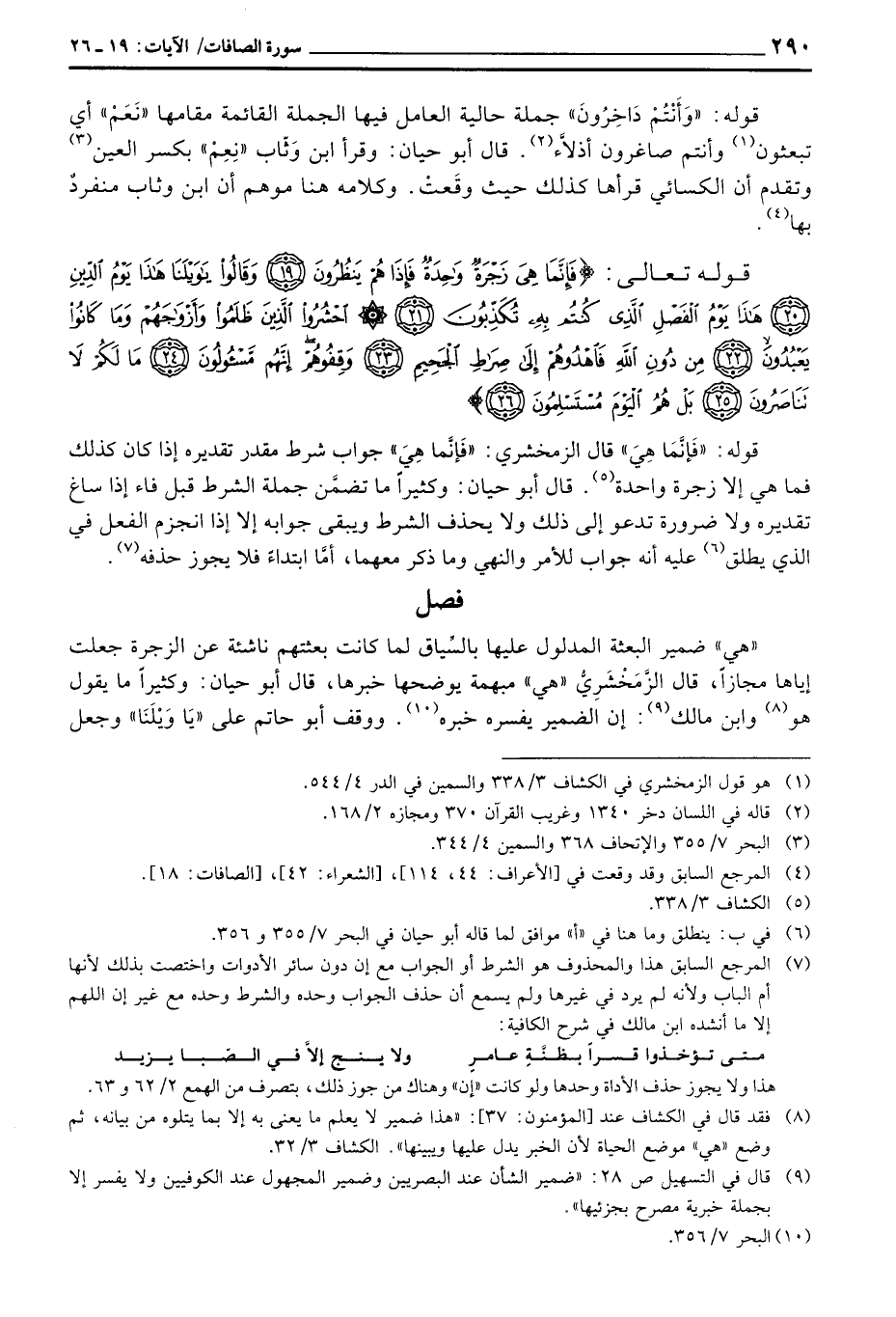 قوله: {فَإِنَّمَا هِيَ} قال الزمخشري: «فَإنَّما هِيَ» جواب شرط مقدر تقديره إذا كان كذلك فما هي إلا زجره واحدة قال أبو حيان: وكثيراً ما تضمَّن جملة الشرط قبل فاء إذا ساغ تقديره ولا ضرورة تدعو إلى ذلك ولا يحذف الشرط ويبقى جوابه إلا إذا انجزم الفعل في الذي يطلق عليه أنه جواب للأمر والنهي وما ذكر معهما، أمَّا اتبداءً فلا يجوز حذفه.