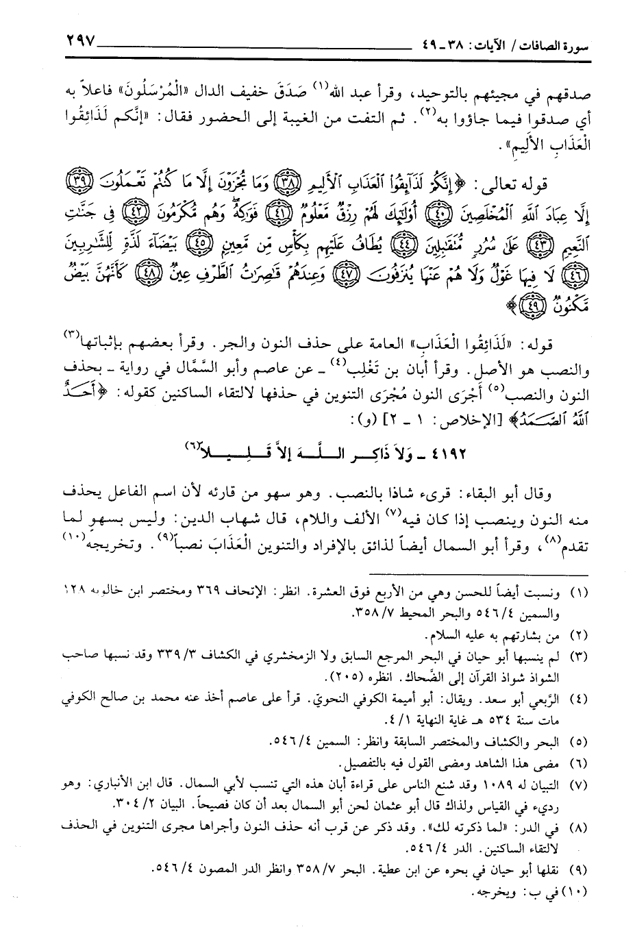 4192 - وَلاَ ذَاكِر اللَّه إلاَّ قَلِيلاً ... وقال أبو البقاء: قرئ شاذا بالنصب وهو سهو من قارئه لأن اسم الفاعل يحذف منه النون وينصب إذا كان فيه الألف واللام، قال شهاب الدين: وليس بسهو لما تقدم، وقرأ أبو السمال أيضاً لذائق بالإفراد والتنوين الْعَذَابَ نصباً وتخريجه.