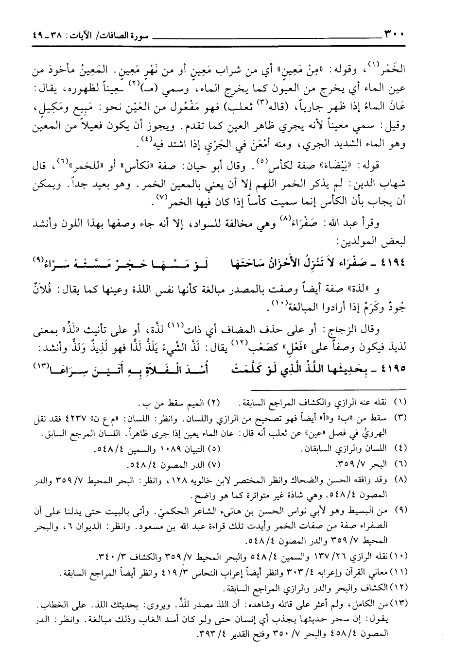قوله: {بَيْضَاءَ} صفة لكأس وقال أبو حيان: صفة «لكاس» أو «للخمر» قال شهاب الدين: لم يذكر الخمر اللهم إلا أن يعني بالمعين الخمر. وهو بعيد جداً ويمكن أن يجاب بأن الكاس إنما، سميت كأساً إذا كان فيها الخمر.
