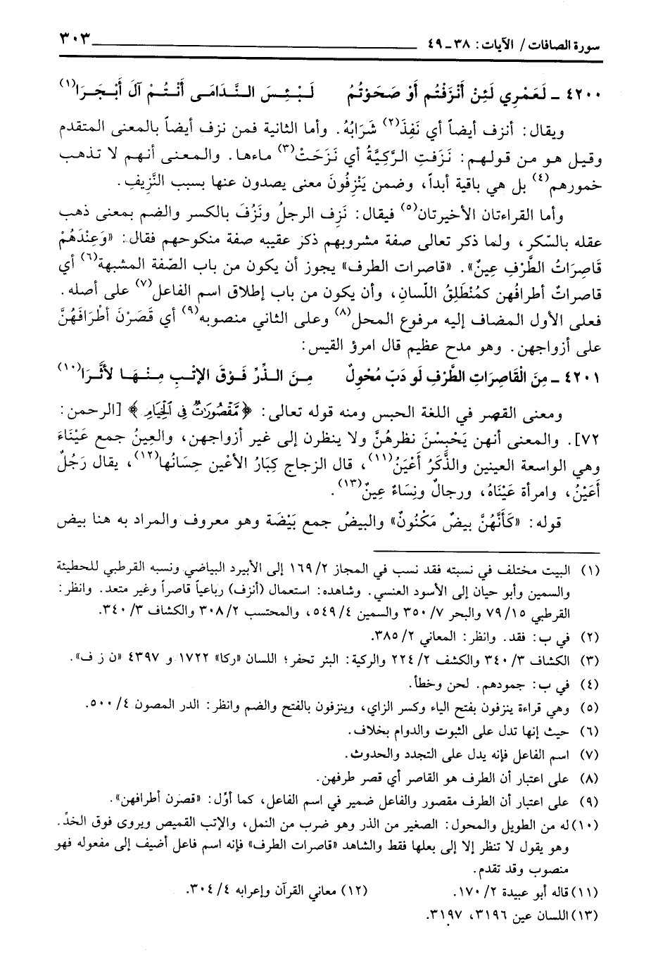 وأما القراءاتان الأخيرتان فيقال: نَزِف الرجلُ ونَزُفَ بالكسر والضم بمعنى ذهب عقله بالسّكر، ولما ذكر تعالى صفة مشروبهم ذكر عقيبه صفة منكوحهم فقال: «وَعِنْدَهُمْ قَاصِرَاتُ الطَّرْفِ عِينٌ» «قاصرات الطرف» يجوز أن يكون من باب الصّفة المشبهة أي قاصراتٌ أطرافُهن كمُنْطَلِقُ اللّسانِ، وأن يكون من باب إطلاق اسم الفاعل على أصله فعلى الأول المضاف إليه مرفوع المحل وعلى الثاني منصوبه أي قَصَرْنَ أطْرَافَهُنَّ على أزواجهن. وهو مدح عظيم قال امرؤ القيس: