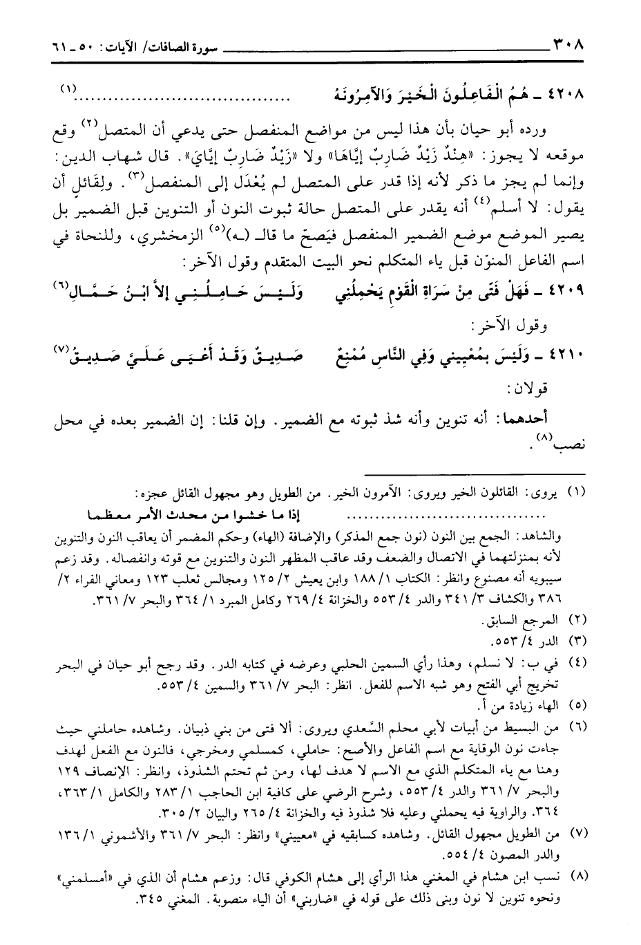 ورده أبو حيان بأن هذا ليس من مواضع المنفصل حتى يدعي أن المتصل وقع موقعه لا يجوز: «هِنْدٌ زَيْدٌ ضَارِبٌ إيَّاهَا» ولا «زَيْدٌ ضَارِبٌ إيَّايَ» قال شهاب الدين: وإنما لم يجز ما ذكر لأنه إذا قدر على المتصل لم يُعْدَل إلى المنفصل ولِقَائلٍ أن يقول: لا أسلم أنه يقدر على المتصل حالة ثبوت النون أو التنوين قبل الضمير بل يصير الموضع موضع الضمير المنفصل فيَصحّ ما قال (هـ) الزمخشري، وللنحاة في اسم الفاعل المنوّن قبل ياء المتكلم نحو البيت المتقدم وقول الآخر: