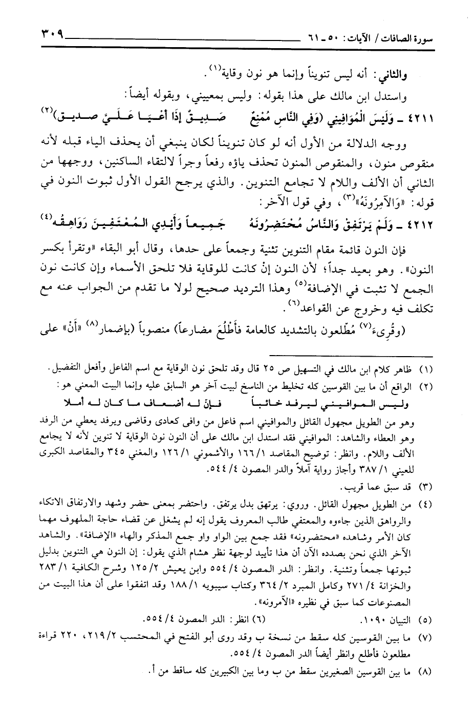 ووجه الدلالة من الأول أنه لو كان تنويناً لكان ينبغي أن يحذف الياء قله لأنه منقوص منون، والمنقوص المنون تحذف ياءؤه رفعاً وجراً لالتقاء الساكنين، ووجهها من الثاني أن الألف واللام لا تجماع التنوين. والذي يرجح لاقول الأول ثبوت لانون في قوله: {وَالآمِرُونَهُ} وفي قول الآخر: