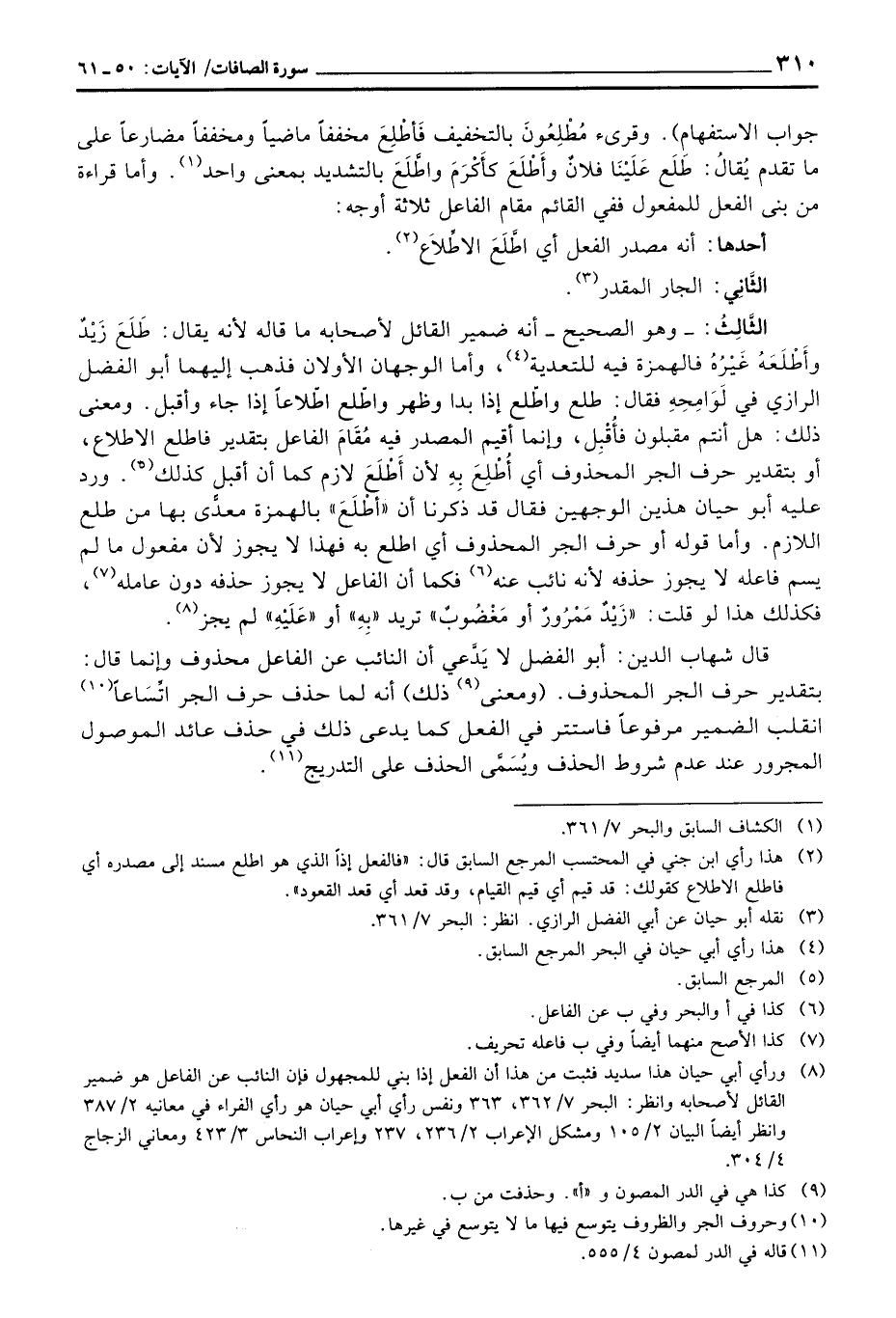 الثَّالِثُ: - وهو الصحيح - أنه ضمير القائل لأصحابه ما قاله لأنه يقال: طَلَعَ زَيْدٌ وأَطْلَعَهُ غَيْرَهُ فالهمزة فيه للتعدية، وأما الوجهان الأولان فذهب إليهما أبو الفضل الرازي في لَوَامِحِهِ فقال: طلع واطّلع إذا بدا وظهر واطّلع اطّلاعاً إذا جاء وأقبل. ومعنى ذلك: هل أنت مقبلون فأُقْبِل، وإنما أقيم المصدر فيه مُقَامَ الفاعل بتقدير فاطلع الاطلاع، أو بتقدير حرف الجر المحذوف أي أُطْلِعَ بِهِ لأن أَطْلََ لازم كما أن أقبل كذلك ورد عليه أبو حيان هذين الوجهين فقال قد ذكرنا أن» أطْلَعَ «بالهمزة معدًّى بها من طلع اللازم. وأما قوله أو حرف الجر المحذوف أي اطلع به فهذا لا يجوز لأن مفعول ما لم يسم فاعله لا يجوز حذفه لأنه نائب عنه فكما أن الفاعل لا يجوز حذفه دون عامله، فكذلك هذا لو قلت:» زَيْدٌ مَمْرُورٌ أو مغْضُوبٌ «تريد» بِهِ «أو» عَلَيْهِ «لم يجز.