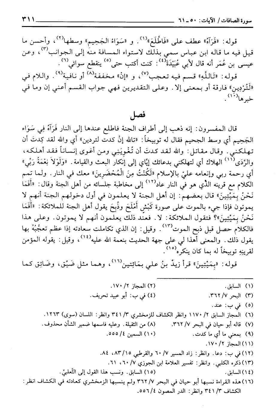 وقال مقاتل: والله لقد كدتَ أن تُغْويَنِي ومن أغوى إنساناً فقد أهلكه، والرَّدَى الهلاك أي لتهلكني بدعائك إيَّاي إلى إنكار البعث والقيامة {وَلَوْلاَ نِعْمَةُ رَبِّي} أي رحمة ربي وإنعامه عليّ بالإسلام {لَكُنْتُ مِنَ الْمُحْضَرِينَ} معك في النار ولما تمم الكلام مع قرينه الذي هو في النار عاد إلى مخاطبة جلسائه من أهل الجنة وقال: {أَفَمَا نَحْنُ بِمَيِّتِينَ} قال بعضهم: إن أهل الجنة لا يعلمون في أول دخولهم الجنة أنهم لا يموتون فإذا جيء بالموت على صورة كَبْشٍ أمْلَحَ وذُبحَ يقول أهل الجنة للملائكة: «أَفَمَا نَحْنُ بِمَيِّتِينَ» ؟ فتقول الملائكة: لا فعند ذلك يعلمون أنهم لا يموتون. وعلى هذا فالكلام حصل قبل ذبح الموت وقيل: إن الذي تكاملت سعادته إذا عظم تعجُّبُهُ بها يقول ذلك. والمعنى أهذا لي على جهة الحديث بنعمة الله عليه وقيلي: يقوله المؤمن لقرينِهِ توبيخاً له بما كان ينكره.
