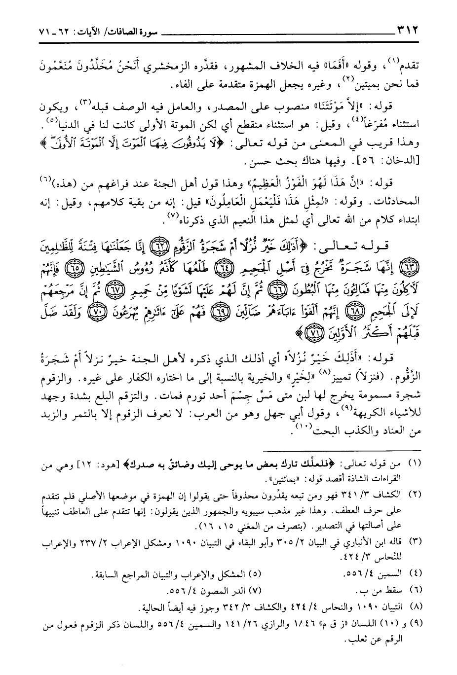 قوله: {أَذَلِكَ خَيْرٌ نُّزُلاً} أي أذلك الذي ذكره لأهل الجنة خيرٌ نزلاً أَمْ شَجَرَةُ الزَّقُّوم. (فنزلاً) تمييز «لِخَيْرِ» والخيرية بالنسبة إلى ما اختاره الكفار على غيره والزقوم شجرة مسموة يخرج لها لبن متى مَسَّ جِسْمَ أحد تورم فمات. والتزقم البلع بشدة وجهد للأشياء الكريهة، وقول أبي جهل وهو العرب: لا نعرف الزقوم إلا بالتمر والزبد من العناد والكذب البحث.