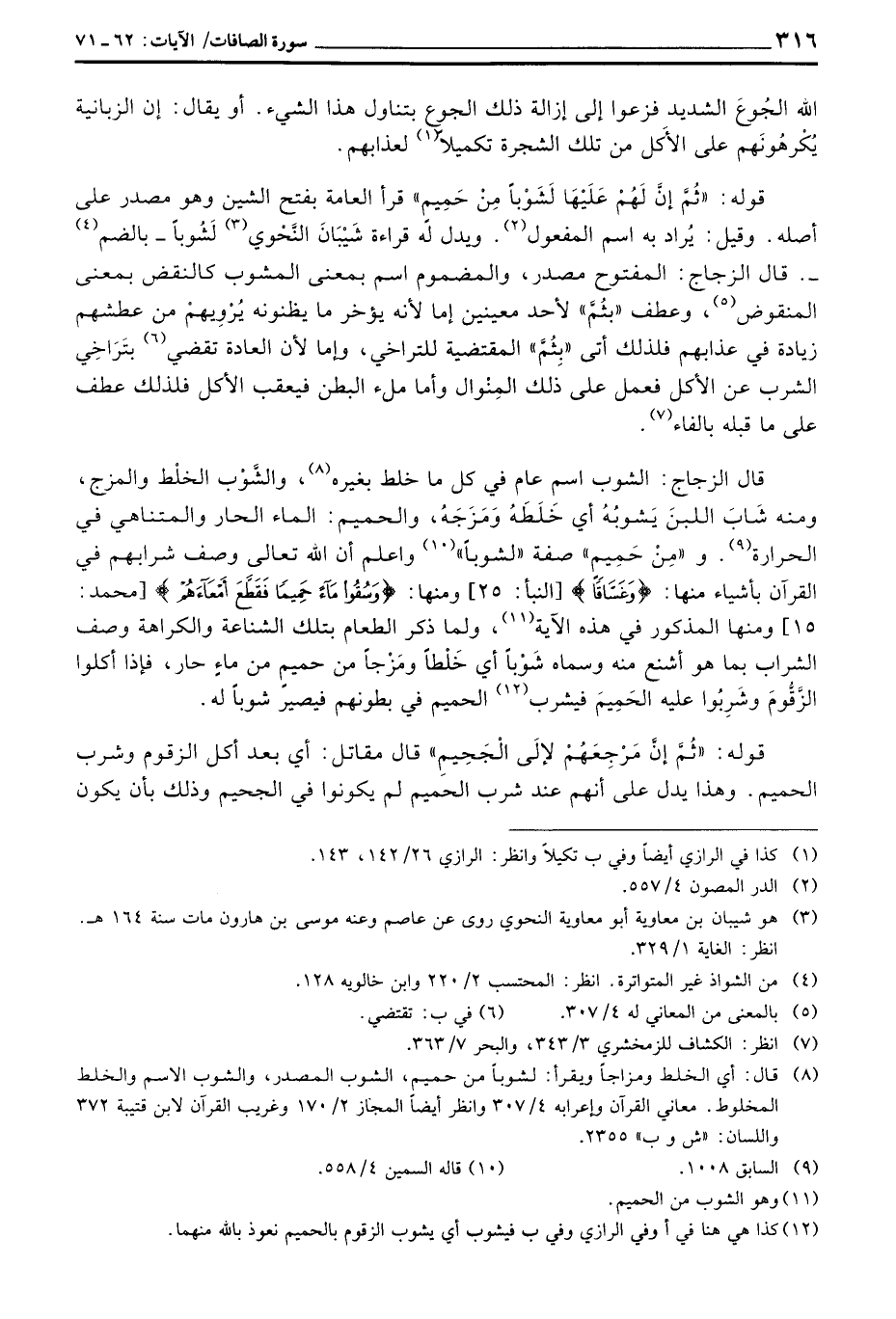 وقيل: يُراد به اسم المفعول ويدل لَه قراءة شَيْبَانَ النَّحْوي لَشُوباً - بالضم - قال الزجاج: المفتوح مصدر، والمضموم اسم بمعنى المشوب كالنقض بمعنى المنقوض وعطف «بثُمَّ» لأحد معينين إما لأنه يؤخر ما يظنونه يُرْوِيهمْ من عطشهم زيادة في عذابهم فلذلك أتى «بِثُمَّ» المقتضية للتراخي، وإما لأن العادة تقضي بتَرَاخِي الشرب عن الأكل فعمل على ذلك المِنْوال وأما ملء البطن فيعقب الأكل فلذلك عطف على ما قبله بالفاء.