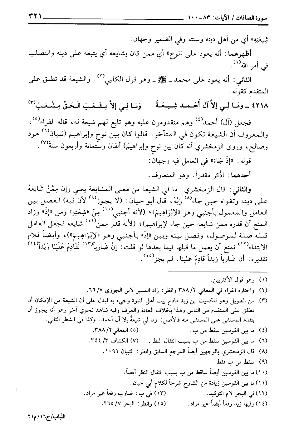 والثاني: قال الزمخشري: ما في الشيعة من معنى المشايعة يعني وإن مِمَّنْ شَايَعَهُ على دينه وتقواه حين جاء رَبَّهُ، قال أبو حيان: (لا يجوز لأن فيه) الفصل بين العامل والمعمول بأجنبي وهو «لإبْرَاهِيمَ» ؛ (لأنه أجنبي مِنْ «شِعَتِهِ» ومن «إذْ» وزاد المنع أن قدره ممن شايعه حين جاء لإبراهيم) ؛ (لأنه قدر ممن شايعه فجعل العامل قبله صلة لموصول، وفصل بينه «إذْ» بأجنبي وهو «لإبْرَاهِيمَ» ) ، وأيضاً فلام الابتداء تمنع أن يعمل ما قبلها فيما بعدها لو قلت: إنَّ ضَارِباً لَقَادِمٌ عَلَيْنَا زَيْداً تقديره: أن ضَارباً زيداً قَادِمٌ علينا لم يجز.