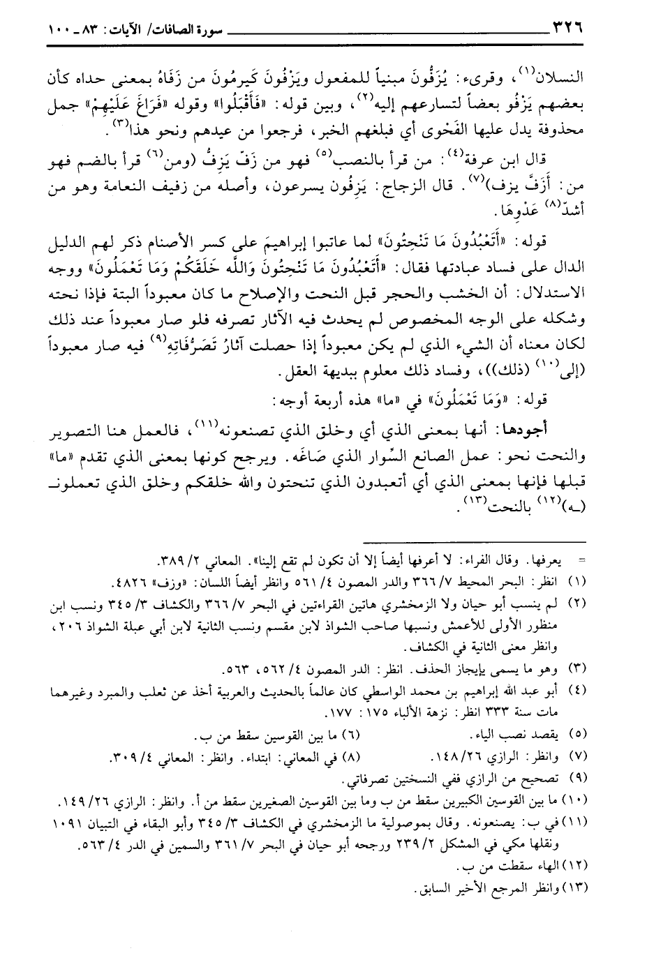 أجودها: أنها بمعنى الذي أي وخلق الذي تصنعونه، فالعمل هنا التصوير والنحت نحو: عمل الصانع السِّوار الذي صَاغَه. ويرجح كونها بمعنى الذي تقدم «ما» قبلها فإنها بمعنى الذي أي أتعبدون الذي تنحتون والله خلقكم الذي تعملون (هـ) بالنحت.