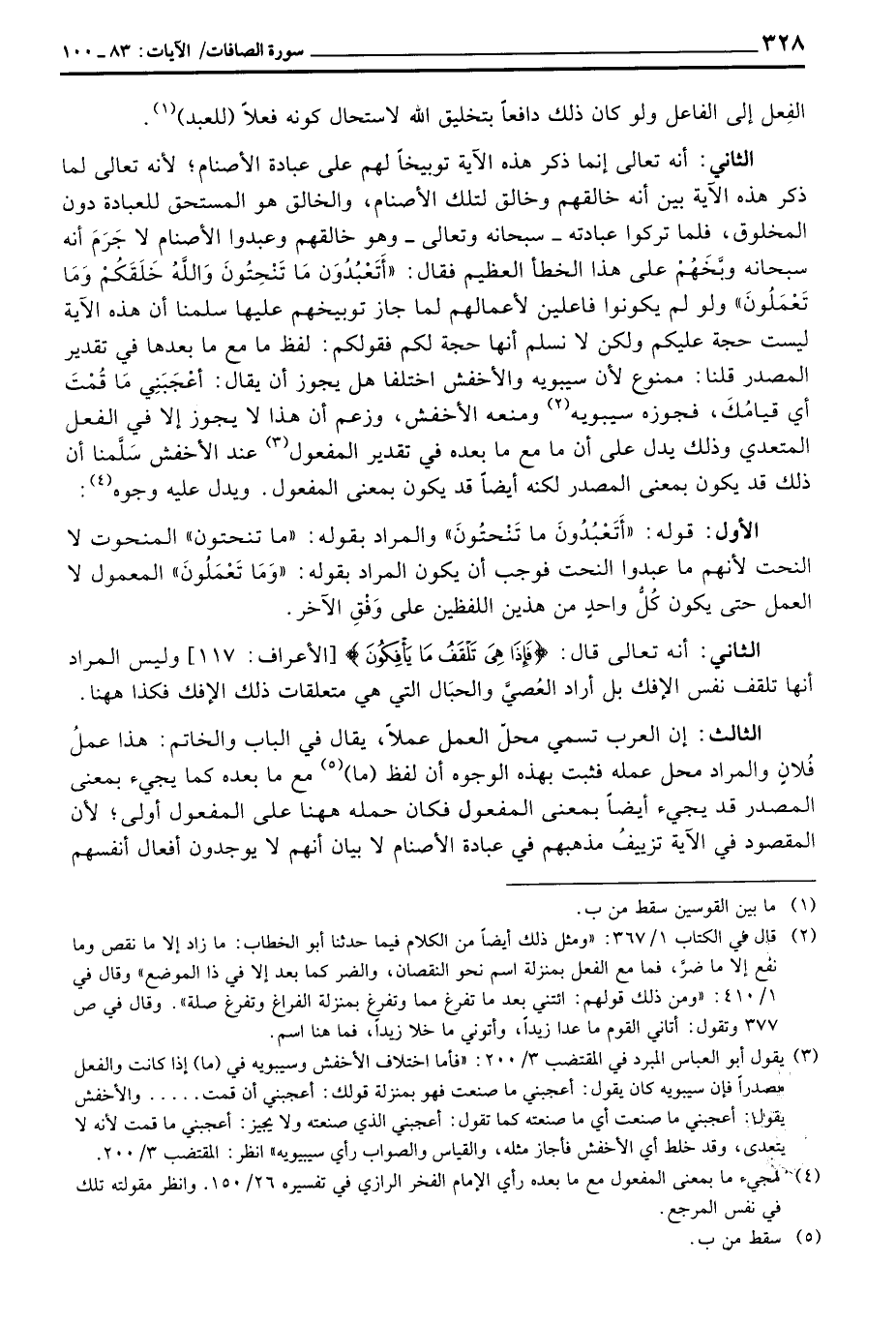الأول: قوله: {} والمراد بقوله: «ما تنحتون» المنحوت لا النحت لأنهم ما عبدوا النحت فوجب أن يكون المراد بقوله: {وَمَا تَعْمَلُونَ} المعمول لا العمل حتى يكون كُلُّ واحدٍ من هذين اللفظين على وَفْقِ الآخر.
